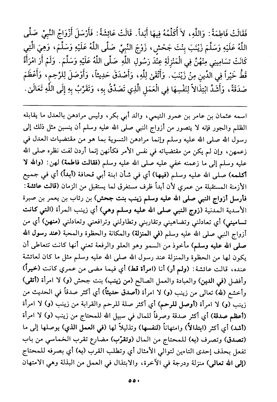 فَقَالت فَاطِمَةُ: وَاللهِ، لَا أُكَلِّمُهُ فِيهَا أَبَدًا. قَالت عَائشَةُ: فَأَرْسَلَ أَزْوَاجُ النَّبِيِّ صَلَّى اللهُ عَلَيهِ وَسَلَّمَ زينَبَ بِنْتَ جَحْشٍ، زَوْجَ النَّبِيِّ صَلَّى اللهُ عَلَيهِ وَسَلَّمَ، وَهِيَ الَّتِي كَانَتْ تسَامِينِي مِنْهُنَّ فِي الْمَنْزِلَةِ عِنْدَ رَسُولِ اللهِ صَلَّى اللهُ عَلَيهِ وَسَلَّمَ. وَلَم أَرَ امْرَأَةً قَط خَيرًا فِي الدِّينِ مِنْ زينَبَ. وَأَتْقَى لِلهِ، وَأَصْدَقَ حَدِيثًا، وَأَوْصَلَ لِلرَّحِم، وَأَعْظَمَ صَدَقَةً، وَأَشَدَّ ابْتِذَالًا لِنَفْسِهَا فِي الْعَمَلِ الَّذِي تَصَدَّقُ بِهِ، وَتَقَرَّبُ بِهِ إِلَى اللهِ تَعَالى