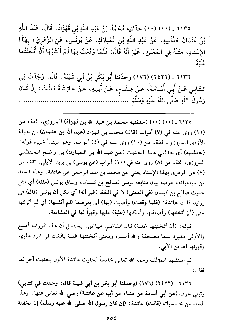 ٦١٣٥ - (٠٠) (٠٠) (حدثنيه محمد بن عبد الله بن قهزاذ) المروزي، ثقة، من (١١) روى عنه في (٧) أبواب (قال) محمد بن قهزاذ (عبد الله بن عثمان) بن جبلة الأزدي المروزي، ثقة، من (١٠) روى عنه في (٤) أبواب، وهو مبتدأ خبره قوله: (حدثنيه) أي حدثني هذا الحديث (عن عبد الله بن المبارك) بن واضح الحنظلي المروزي، ثقة، من (٨) روى عنه في (١٠) أبواب (عن يونس) بن يزيد الأيلي، ثقة، من (٧) عن الزهري بهذا الإسناد يعني عن محمد بن عبد الرحمن عن عائشة. وهذا السند من سباعياته، غرضه بيان متابعة يونس لصالح بن كيسان، وساق يونس (مثله) أي مثل حديث صالح بن كيسان (في المعنى) لا في اللفظ (غير أنه) أي لكن أن يونس (قال) في روايته قالت عائشة: (فلما وقعت) وأصبت (بها) أي بعرضها (لم أنشبها) أي لم أتركها حتى (أن أثخنتها) وأضعفتها وأسكتها (فلبة) عليها وقهرًا لها في المشاتمة.
