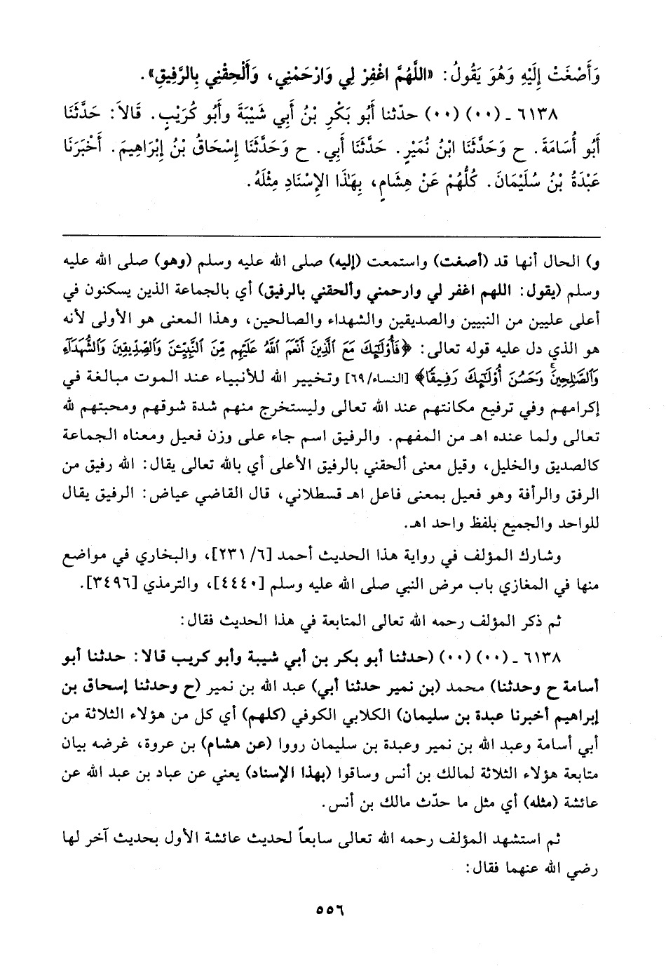 وَأَصْغَت إِلَيهِ وَهُوَ يَقُولُ: "اللَّهُمَّ اغْفِرْ لِي وَارْحَمْنِي، وَأَلْحِقْنِي بِالرَّفِيقِ".