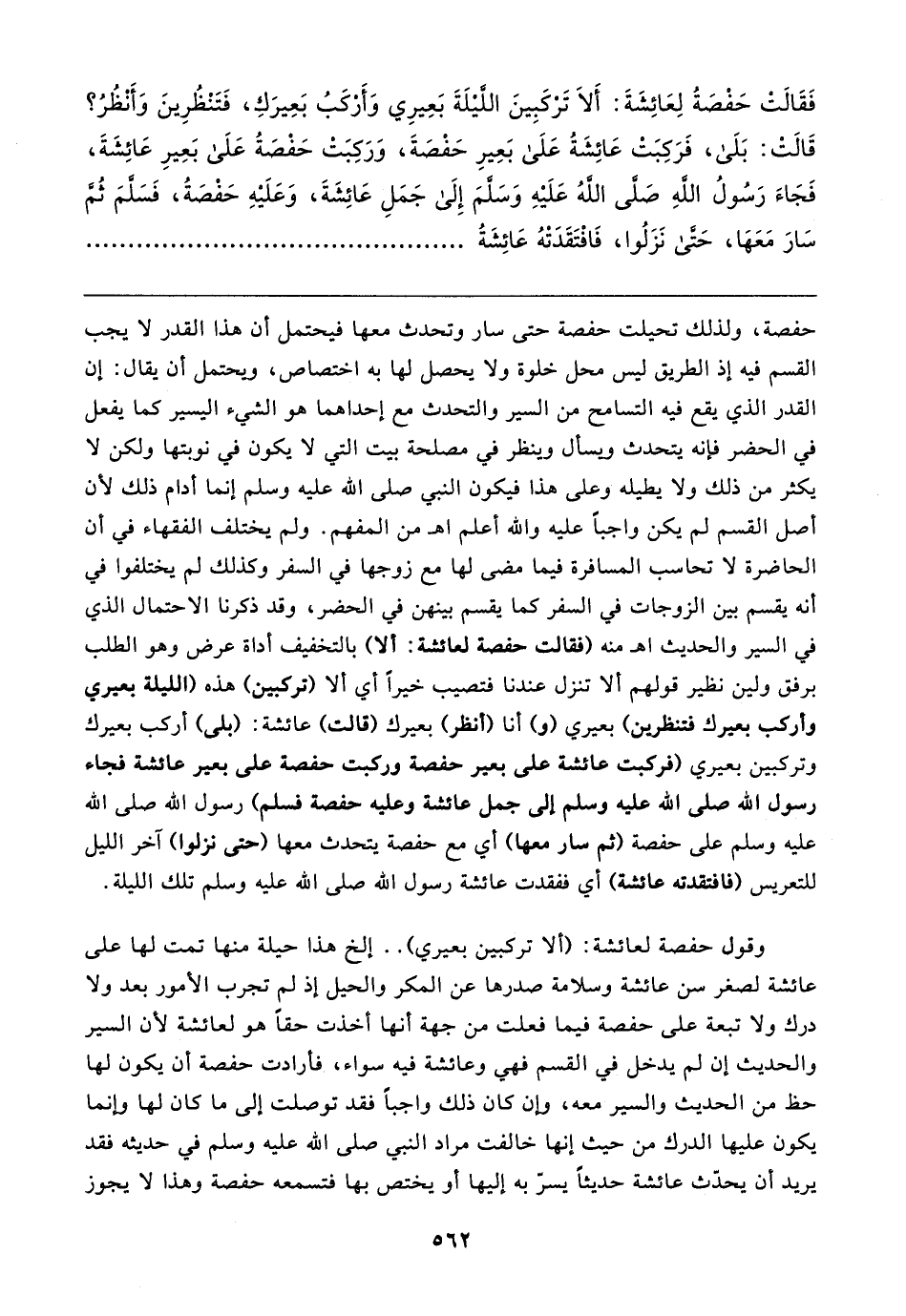 حفصة، ولذلك تحيلت حفصة حتى سار وتحدث معها فيحتمل أن هذا القدر لا يجب القسم فيه إذ الطريق ليس محل خلوة ولا يحصل لها به اختصاص، ويحتمل أن يقال: إن القدر الذي يقع فيه التسامح من السير والتحدث مع إحداهما هو الشيء اليسير كما يفعل في الحضر فإنه يتحدث ويسأل وينظر في مصلحة بيت التي لا يكون في نوبتها ولكن لا يكثر من ذلك ولا يطيله وعلى هذا فيكون النبي صلى الله عليه وسلم إنما أدام ذلك لأن أصل القسم لم يكن واجبًا عليه والله أعلم اهـ من المفهم. ولم يختلف الفقهاء في أن الحاضرة لا تحاسب المسافرة فيما مضى لها مع زوجها في السفر وكذلك لم يختلفوا في أنه يقسم بين الزوجات في السفر كما يقسم بينهن في الحضر، وقد ذكرنا الاحتمال الذي في السير والحديث اهـ منه (فقالت حفصة لعائشة: ألا) بالتخفيف أداة عرض وهو الطلب برفق ولين نظير قولهم ألا تنزل عندنا فتصيب خيرًا أي ألا (تركبين) هذه (الليلة بعيري وأركب بعيرك فتنظرين) بعيري (و) أنا (أنظر) بعيرك (قالت) عائشة: (بلى) أركب بعيرك وتركبين بعيري (فركبت عائشة على بعير حفصة وركبت حفصة على بعير عائشة فجاه رسول الله صلى الله عليه وسلم إلى جمل عائشة وعليه حفصة فسلم) رسول الله صلى الله عليه وسلم على حفصة (ثم صار معها) أي مع حفصة يتحدث معها (حتى نزلوا) آخر الليل للتعريس (فافتقدته عائشة) أي ففقدت عائشة رسول الله صلى الله عليه وسلم تلك الليلة.