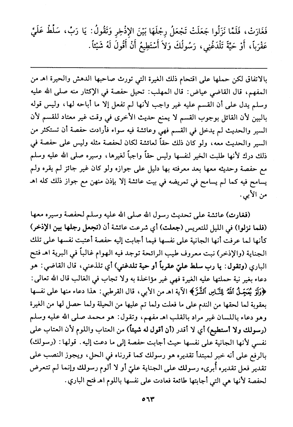 بالاتفاق لكن حملها على اقتحام ذلك الغيرة التي تورث صاحبها الدهش والحيرة اهـ من المفهم، قال القاضي عياض: قال المهلب: تحيل حفصة في الإكثار منه صلى الله عليه وسلم يدل على أن القسم عليه غير واجب لأنها لم تفعل إلا ما أباحه لها، وليس قوله بالبين لأن القائل بوجوب القسم لا يمنع حديث الأخرى في وقت غير معتاد للقسم لأن السير والحديث لم يدخل في القسم فهي وعائشة فيه سواء فأرادت حفصة أن تستكثر من السير والحديث معه، ولو كان ذلك حقًّا لعائشة لكان لحفصة مثله وليس على حفصة في ذلك درك لأنها طلبت الخير لنفسها وليس حقًّا واجبًا لغيرها، وسيره صلى الله عليه وسلم مع حفصة وحديثه معها بعد معرفته بها دليل على جوازه ولو كان غير جائز لم يقره ولم يسامح فيه كما لم يسامح في تمريضه في بيت عائشة إلا بإذن منهن مع جواز ذلك كله اهـ من الأبي.