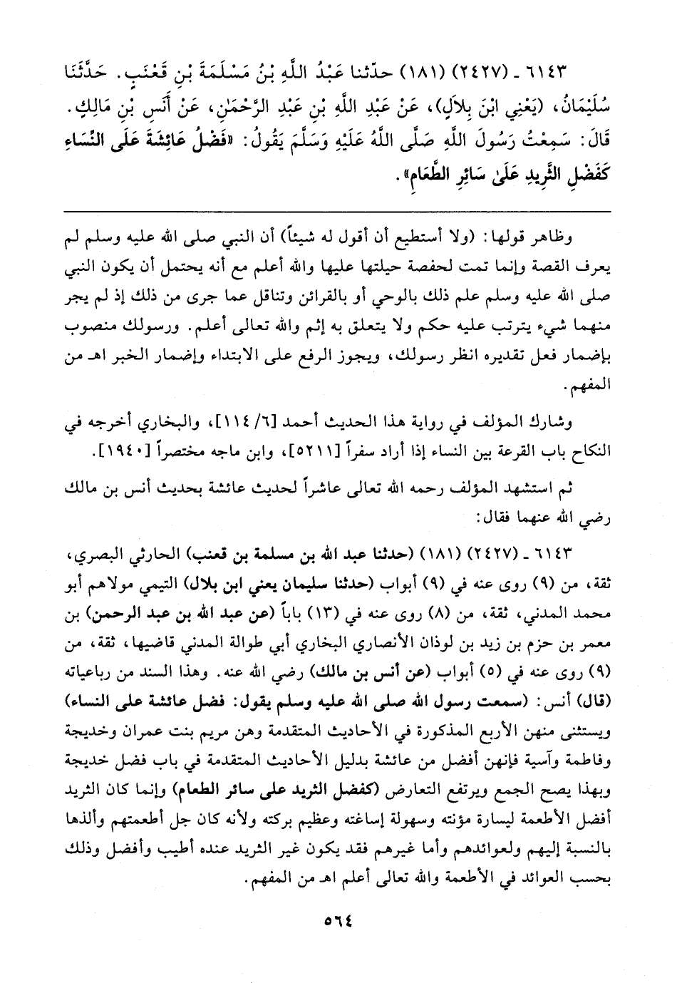 ٦١٤٣ - (٢٤٢٧) (١٨١) (حدثنا عبد الله بن مسلمة بن قعنب) الحارثي البصري، ثقة، من (٩) روى عنه في (٩) أبواب (حدثنا سليمان يعني ابن بلال) التيمي مولاهم أبو محمد المدني، ثقة، من (٨) روى عنه في (١٣) بابا (عن عبد الله بن عبد الرحمن) بن معمر بن حزم بن زيد بن لوذان الأنصاري البخاري أبي طوالة المدني قاضيها، ثقة، من (٩) روى عنه في (٥) أبواب (عن أنس بن مالك) رضي الله عنه. وهذا السند من رباعياته (قال) أنس: (سمعت رسول الله صلى الله عليه وسلم يقول: فضل عائشة على النساء) ويستثنى منهن الأربع المذكورة في الأحاديث المتقدمة وهن مريم بنت عمران وخديجة وفاطمة وآسية فإنهن أفضل من عائشة بدليل الأحاديث المتقدمة في باب فضل خديجة وبهذا يصح الجمع ويرتفع التعارض كفضل الثريد على سائر الطعام) وإنما كان الثريد أفضل الأطعمة ليسارة مؤنته وسهولة إساغته وعظيم بركته ولأنه كان جل أطعمتهم وألذها بالنسبة إليهم ولعوائدهم وأما غيرهم فقد يكون غير الثريد عنده أطيب وأفضل وذلك بحسب العوائد في الأطعمة والله تعالى أعلم اهـ من المفهم.