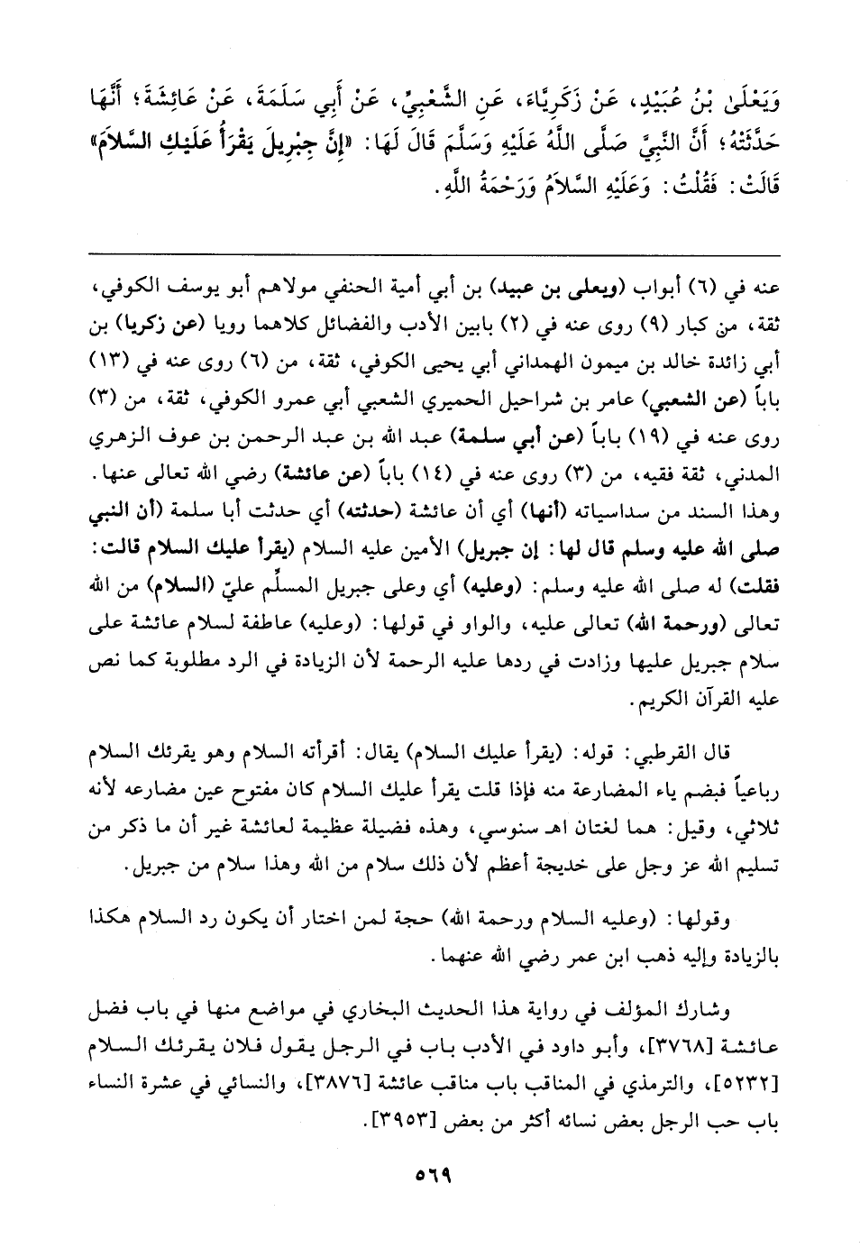 عنه في (٦) أبواب (وبعلي بن عبيد) بن أبي أمية الحنفي مولاهم أبو يوسف الكوفي، ثقة، من كبار (٩) روى عنه في (٢) بابين الأدب والفضائل كلاهما رويا (عن زكريا) بن أبي زائدة خالد بن ميمون الهمداني أبي يحيى الكوفي، ثقة، من (٦) روى عنه في (١٣) بابا (عن الشعبي) عامر بن شراحيل الحميري الشعبي أبي عمرو الكوفي، ثقة، من (٣) روى عنه في (١٩) بابا (عن أبي سلمة) عبد الله بن عبد الرحمن بن عوف الزهري المدني، ثقة فقيه، من (٣) روى عنه في (١٤) بابا (عن عائشة) رضي الله تعالى عنها. وهذا السند من سداسياته (أنها) أي أن عائشة (حدثته) أي حدثت أبا سلمة (أن النبي صلى الله عليه وسلم قال لها: إن جبريل) الأمين - عليه السلام - (يقرأ عليك السلام فالت: فقلت) له صلى الله عليه وسلم: (وعليه) أي وعلى جبريل المسلِّم عليّ (السلام) من الله تعالى (ورحمة الله) تعالى عليه، والواوفي قولها: (وعليه) عاطفة لسلام عائشة على سلام جبريل عليها وزادت في ردها عليه الرحمة لأن الزيادة في الرد مطلوبة كما نص عليه القرآن الكريم.