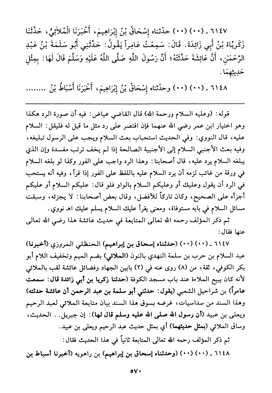 ٦١٤٧ - (٠٠) (٠٠) (حدثناه إسحاق بن إبراهيم) الحنظلي المروزي (أخبرنا) عبد السلام بن حرب بن سلمة النهدي بالنون (الملائي) بضم الميم وتخفيف اللام أبو بكر الكوفي، ثقة، من (٨) روى عنه في (٢) بابين الجهاد وفضائل عائشة لقب بالملائي لأنه كان يبيع الملاءة عند باب مسجد الكوفة (حدثنا زكريا بن أبي زائدة قال: سمعت عامرًا) بن شراحيل الشعبي (يقول: حدثني أبو سلمة بن عبد الرحمن أن عائشة حدثته) وهذا السند من سداسيات، غرضه بسوق هذا السند بيان متابعة الملائي لعبد الرحيم ويعلى بن عبيد (أن رسول الله صلى الله عليه وسلم قال لها): إن جبريل .. الحديث، وساق الملائي (بمثل حديثهما) أي بمثل حديث عبد الرحيم ويعلي بن عبيد.
