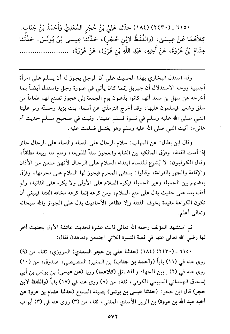 ٦١٥٠ - (٢٤٣٠) (١٨٤) (حدثنا علي بن حجر السعدي) المروزي، ثقة، من (٩) روى عنه في (١١) بابا (وأحمد بن جناب) بن المغيرة المصيصي، صدوق، من (١٠) روى عنه في (٢) بابين الجهاد والفضائل (كلاهما) رويا (عن عيسى) بن يونس بن أبي إسحاق الهمداني السبيعي الكوفي، ثقة، من (٨) روى عنه في (١٧) بابا (واللفظ لابن حجر) قال ابن حجر: (حدثنا عيسى بن يونس) بصيغة السماع (حدثنا هشام بن عروة عن أخيه عبد الله بن عروة) بن الزبير الأسدي المدني، ثقة، من (٣) روى عنه في (٣) أبواب