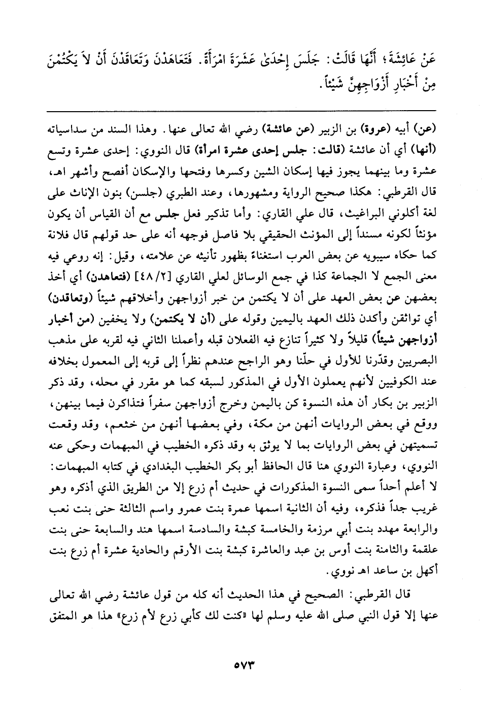 (عن) أبيه (عروة) بن الزبير (عن عائشة) رضي الله تعالى عنها. وهذا السند من سداسياته (أنها) أي أن عائشة (قالت: جلس إحدى عشرة امرأة) قال النووي: إحدى عشرة وتسع عشرة وما بينهما يجوز فيها إسكان الشين وكسرها وفتحها والإسكان أفصح وأشهر اهـ، قال القرطبي: هكذا صحيح الرواية ومشهورها، وعند الطبري (جلسن) بنون الإناث على لغة أكلوني البراغيث، قال علي القاري: وأما تذكير فعل جلس مع أن القياس أن يكون مؤنثًا لكونه مسندًا إلى المؤنث الحقيقي بلا فاصل فوجهه أنه على حد قولهم قال فلانة كما حكاه سيبويه عن بعض العرب استغناءً بظهور تأنيثه عن علامته، وقيل: إنه روعي فيه معنى الجمع لا الجماعة كذا في جمع الوسائل لعلي القاري [٢/ ٤٨] (فتعاهدن) أي أخذ بعضهن عن بعض العهد على أن لا يكتمن من خبر أزواجهن وأخلاقهم شيئًا (وتعاقدن) أي تواثقن وأكدن ذلك العهد باليمين وقوله على (أن لا يكتمن) ولا يخفين (من أخبار أزواجهن شيئًا) قليلًا ولا كثيرًا تنازع فيه الفعلان قبله وأعملنا الثاني فيه لقربه على مذهب البصريين وقدّرنا للأول في حفنا وهو الراجح عندهم نظرا إلى قربه إلى المعمول بخلافه عند الكوفيين لأنهم يعملون الأول في المذكور لسبقه كما هو مقرر في محله، وقد ذكر الزبير بن بكار أن هذه النسوة كن باليمن وخرج أزواجهن سفرا فتذاكرن فيما بينهن، ووقع في بعض الروايات أنهن من مكة، وفي بعضها أنهن من خثعم، وقد وقعت تسميتهن في بعض الروايات بما لا يوثق به وقد ذكره الخطيب في المبهمات وحكى عنه النووي، وعبارة النووي هنا قال الحافظ أبو بكر الخطيب البغدادي في كتابه المبهمات: لا أعلم أحدًا سمى النسوة المذكورات في حديث أم زرع إلا من الطريق الذي أذكره وهو غريب جدًّا فذكره، وفيه أن الثانية اسمها عمرة بنت عمرو واسم الثالثة حنى بنت نعب والرابعة مهدد بنت أبي مرزمة والخامسة كبشة والسادسة اسمها هند والسابعة حنى بنت علقمة والثامنة بنت أوس بن عبد والعاشرة كبشة بنت الأرقم والحادية عشرة أم زرع بنت أكهل بن ساعد اهـ نووي.