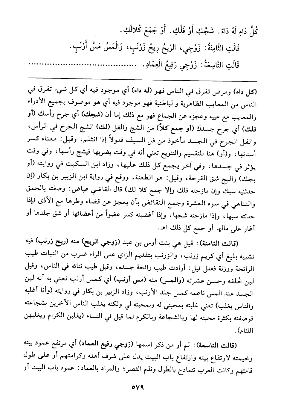 (قالت الثامنة): قيل هي بنت أوس بن عبد (زوجي الريح) منه (ريح زرنب) فيه تشبيه بليغ أي كريم زرنب، والزرنب بتقديم الزاي على الراء ضرب من النبات طيب الرائحة ووزنة فعلل قيل: أرادت طيب رائحة جسده، وقيل طيب ثنائه في الناس، وقيل لين خُلقه وحسن عشرته (والمس) منه (مس أرنب) أي كمس أرنب تعني به أنه لين الجسد عند المس ناعمه كمس جلد الأرنب، وزاد الزبير بن بكار في روايته (وأنا أغلبه والناس يغلب) تعني غلبته بمحبتي له وبمحبته لي ولكنه يغلب الناس الآخرين بشجاعته فوصفته بكثرة محبته لها وبالشجاعة وبالكرم لما قيل في النساء (يغلبن الكرام ويغلبهن اللئام).