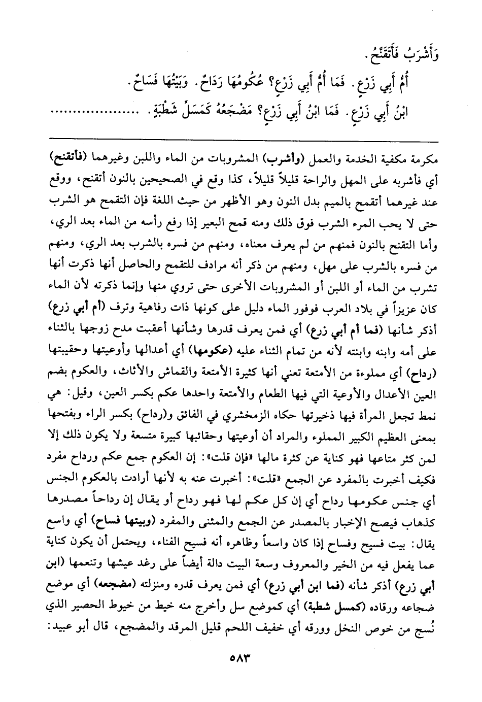مكرمة مكفية الخدمة والعمل (وأشرب) المشروبات من الماء واللبن وغيرهما (فأتقنح) أي فأشربه على المهل والراحة قليلًا قليلًا، كذا وقع في الصحيحين بالنون أتقنح، ووقع عند غيرهما أتقمح بالميم بدل النون وهو الأظهر من حيث اللغة فإن التقمح هو الثرب حتى لا يحب المرء الشرب فوق ذلك ومنه قمح البعير إذا رفع رأسه من الماء بعد الري، وأما التقنح بالنون فمنهم من لم يعرف معناه، ومنهم من فسره بالشرب بعد الري، ومنهم من فسره بالشرب على مهل، ومنهم من ذكر أنه مرادف للتقمح والحاصل أنها ذكرت أنها تشرب من الماء أو اللبن أو المشروبات الأخرى حتى تروي منها وإنما ذكرته لأن الماء كان عزيزًا في بلاد العرب فوفور الماء دليل على كونها ذات رفاهية وترف (أم أبي زرع) أذكر شأنها (فما أم أبي زرع) أي فمن يعرف قدرها وشأنها أعقبت مدح زوجها بالثناء على أمه وابنه وابنته لأنه من تمام الثناء عليه (عكومها) أي أعدالها وأوعيتها وحقيبتها (رداح) أي مملوءة من الأمتعة تعني أنها كثيرة الأمتعة والقماش والأثاث، والعكوم بضم العين الأعدال والأوعية التي فيها الطعام والأمتعة واحدها عكم بكسر العين، وقيل: هي نمط تجعل المرأة فيها ذخيرتها حكاه الزمخشري في الفائق و (رداح) بكسر الراء وبفتحها بمعنى العظيم الكبير المملوء والمراد أن أوعيتها وحقائبها كبيرة متسعة ولا يكون ذلك إلا لمن كثر متاعها فهو كناية عن كثرة مالها "فإن قلت": إن العكوم جمع عكم ورداح مفرد فكيف أخبرت بالمفرد عن الجمع "قلت": أخبرت عنه به لأنها أرادت بالعكوم الجنس أي جنس عكومها رداح أي إن كل عكم لها فهو رداح أو يقال إن رداحًا مصدرها كذهاب فيصح الاخبار بالمصدر عن الجمع والمثنى والمفرد (وبيتها فساح) أي واسع يقال: بيت فسيح وفساح إذا كان واسعًا وظاهره أنه فسيح الفناء، ويحتمل أن يكون كناية عما يفعل فيه من الخير والمعروف وسعة البيت دالة أيضًا على رغد عيشها وتنعمها (ابن أبي زرع) أذكر شأنه (فما ابن أبي زرع) أي فمن يعرف قدره ومنزلته (مضجعه) أي موضع ضجاعه ورقاده (كمسل شطبة) أي كموضع سل وأخرج منه خيط من خيوط الحصير الذي نُسج من خوص النخل وورقه أي خفيف اللحم قليل المرقد والمضجع، قال أبو عبيد: