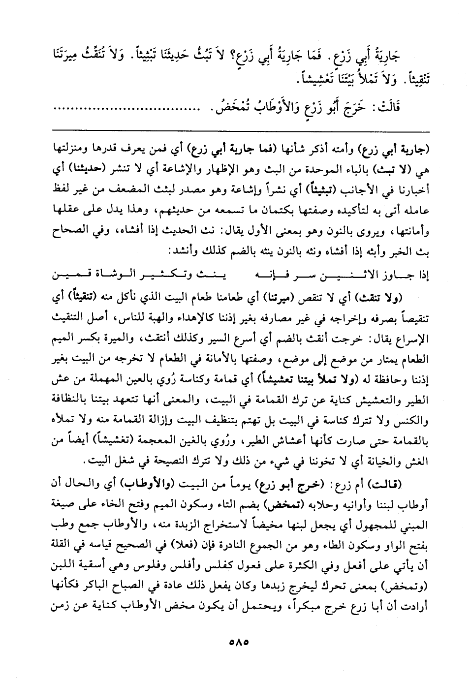 جَارِيةُ أَبِي زَرْعٍ. فَمَا جَارِيةُ أَبِي زَرْعٍ؛ لَا تَبُثُّ حَدِيثَنَا تَبْثِيثًا. وَلَا تُنَقِّثُ مِيرَتَنَا تَنْقِيثًا. وَلَا تَمْلأُ بَيتَنَا تَعْشِيشًا.