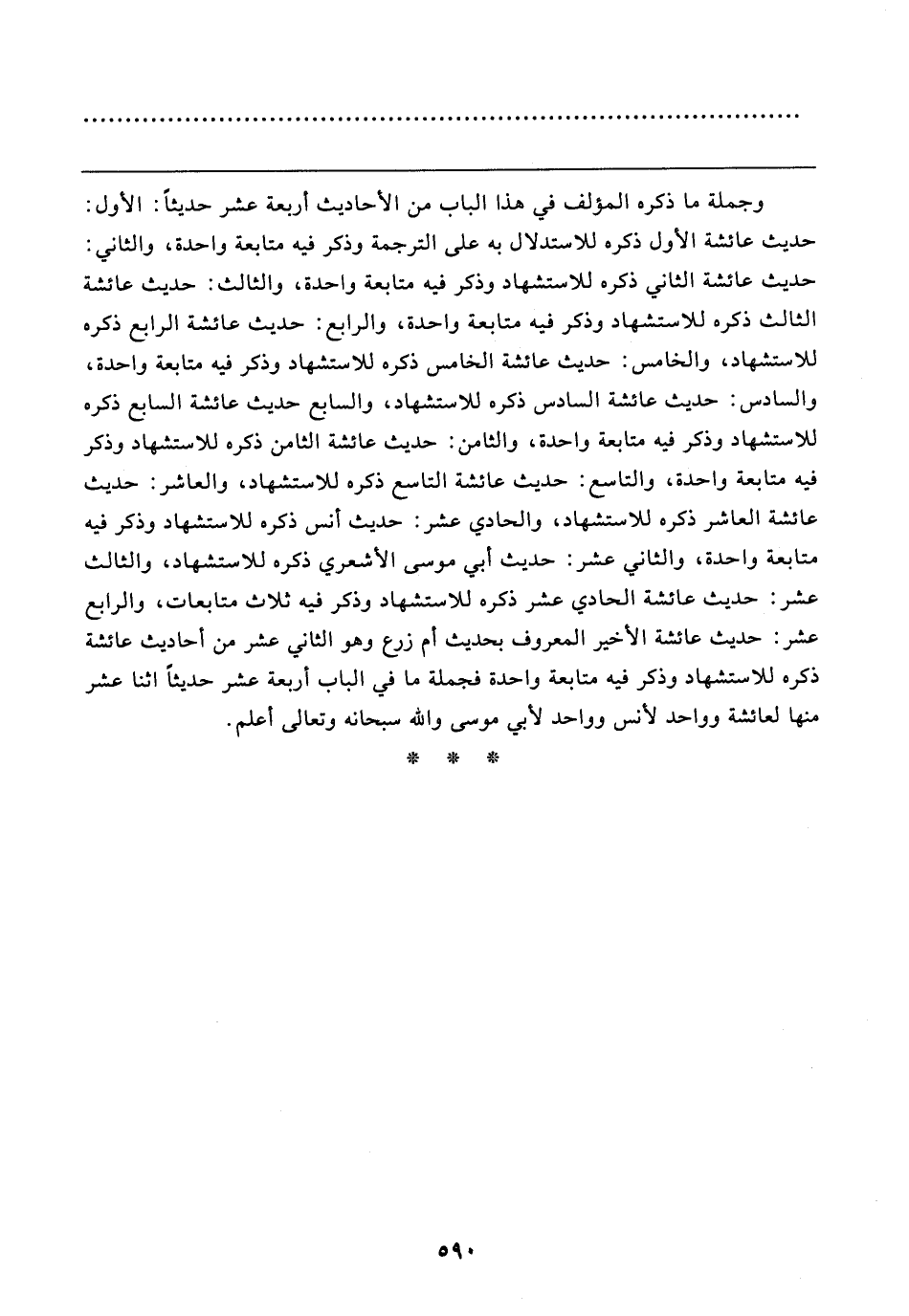 وجملة ما ذكره المؤلف في هذا الباب من الأحاديث أربعة عشر حديثًا: الأول: حديث عائشة الأول ذكره للاستدلال به على الترجمة وذكر فيه متابعة واحدة، والثاني: حديث عائشة الثاني ذكره للاستشهاد وذكر فيه متابعة واحدة، والثالث: حديث عائشة الثالث ذكره للاستشهاد وذكر فيه متابعة واحدة، والرابع: حديث عائشة الرابع ذكره للاستشهاد، والخامس: حديث عائشة الخامس ذكره للاستشهاد وذكر فيه متابعة واحدة، والسادس: حديث عائشة السادس ذكره للاستشهاد، والسابع حديث عائشة السابع ذكره للاستشهاد وذكر فيه متابعة واحدة، والثامن: حديث عائشة الثامن ذكره للاستشهاد وذكر فيه متابعة واحدة، والتاسع: حديث عائشة التاسع ذكره للاستشهاد، والعاشر: حديث عائشة العاشر ذكره للاستشهاد، والحادي عثر: حديث أنس ذكره للاستشهاد وذكر فيه متابعة واحدة، والثاني عشر: حديث أبي موسى الأشعري ذكره للاستشهاد، والثالث عشر: حديث عائشة الحادي عشر ذكره للاستشهاد وذكر فيه ثلاث متابعات، والرابع عشر: حديث عائشة الأخير المعروف بحديث أم زرع وهو الثاني عثر من أحاديث عائشة ذكره للاستشهاد وذكر فيه متابعة واحدة فجملة ما في الباب أربعة عشر حديثًا اثنا عشر منها لعائشة وواحد لأنس وواحد لأبي موسى والله سبحانه وتعالى أعلم.