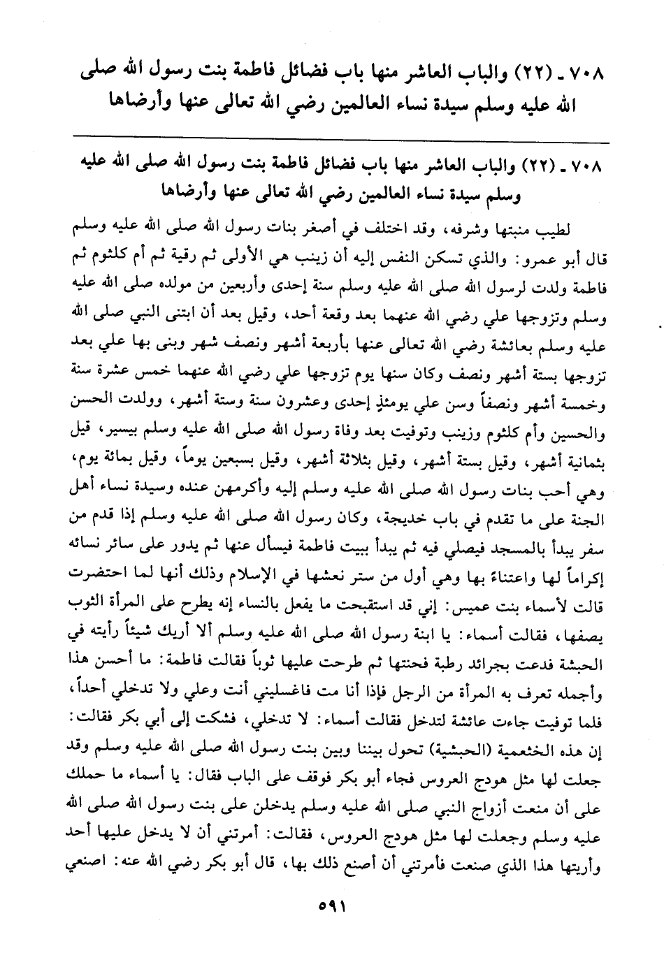 ٧٠٨ - (٢٢) والباب العاشر منها باب فضائل فاطمة بنت رسول الله صلى الله عليه وسلم سيدة نساء العالمين رضي الله تعالى عنها وأرضاها
