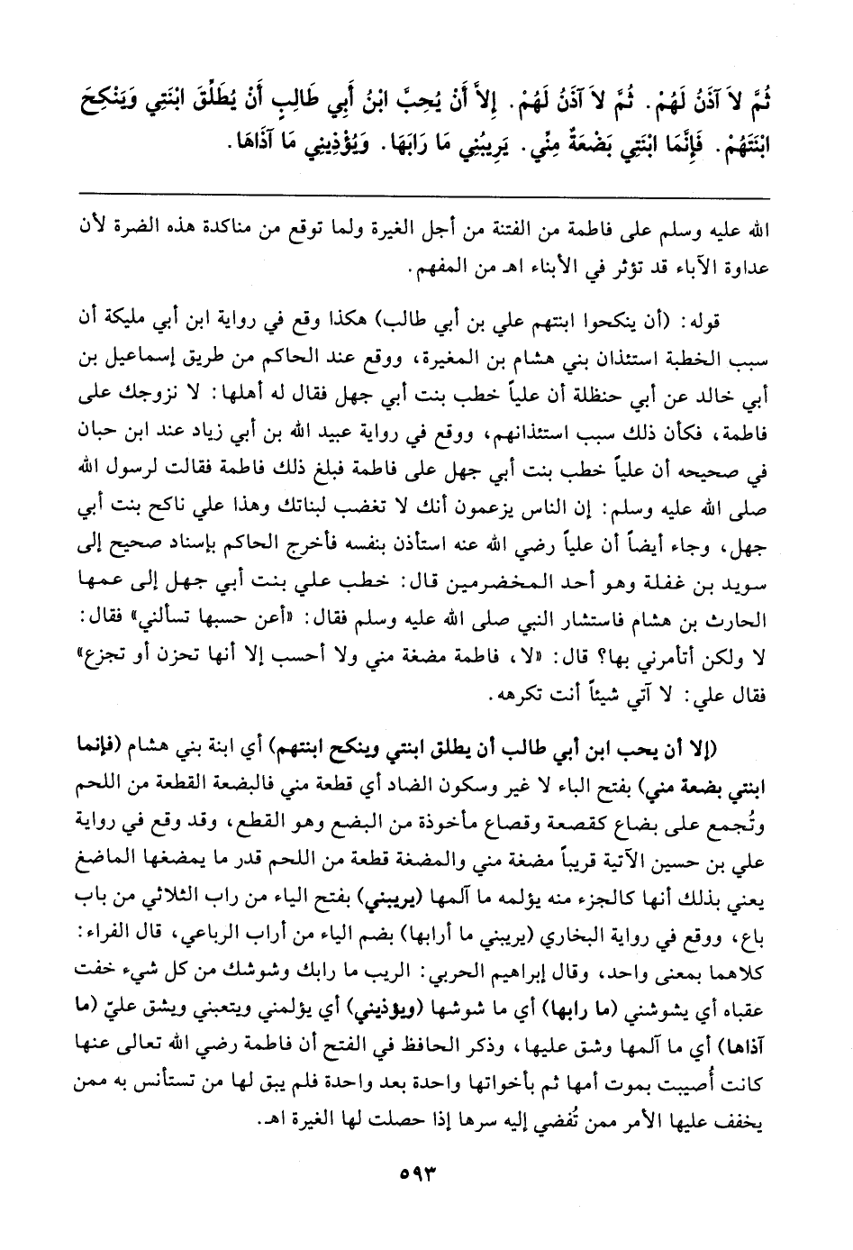 ثُمَّ لَا آذَنُ لَهُمْ. ثُمَّ لَا آذَنُ لَهُمْ. إلا أَنْ يُحِبَّ ابْنُ أَبِي طَالِبٍ أَنْ يُطَلِّقَ ابْنَتِي وَيَنْكِحَ ابْنَتَهُمْ. فَإنَّمَا ابْنَتِي بَضْعَةٌ مِنِّي. يَرِيبُنِي مَا رَابَهَا. وَيُؤْذِينِي مَا آذَاهَا