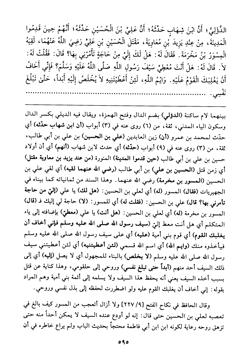 بينهما لام ساكنة (الدؤلي) بضم الدال وفتح الهمزة، ويقال فيه الديلي بكسر الدال وسكون الياء المدني، ثقة، من (٦) روى عنه في (٣) أبواب (أن ابن شهاب حدّثه) أي حدّث لمحمد بن عمرو (أن) زين العابدين (علي بن الحسين) بن علي بن أبي طالب، ثقة، من (٣) روى عنه في (٩) أبواب (حدّثه) أي حدث لابن شهاب (أنهم) أي أن أولاد حسين بن علي بن أبي طالب (حين قدموا المدينة) المنورة (من عند يزيد بن معاوية مقتل) أي زمن قتل (الحسين بن علي) بن أبي طالب (رضي الله عنهما لقيه) أي لقي علي بن الحسين (المسور بن مخرمة) رضي الله عنهما. وهذا السند من ثمانياته كما بيناه في الجهيريات (فقال) المسور إله) أي لعلي بن الحسين: (هل لك) يا علي (إليّ من حاجة تأمرني بها؟ قال) علي بن الحسين: (فقلت له) أي للمسور: (لا) حاجة لي إليك فـ (قال) المسور بن مخرمة (له) أي لعلي بن الحسين: (هل أنت) يا علي (معطيّ) بإضافته إلى ياء المتكلم أي هل أنت معط إليّ (سيف رسول الله صلى الله عليه وسلم فإني أخاف أن يغلبك القوم) أي قوم بني أمية (عليه) أي على سيف رسول الله صلى الله عليه وسلم فيأخذوه منك (وايم الله) أي اسم الله قسمي (لئن أعطيتنيه) أي لئن أعطيتني سيف رسول الله صلى الله عليه وسلم (لا يخلص) بالبناء للمجهول أي لا يصل (إليه) أي إلى ذلك السيف أحد منهم (أبدًا حتى تبلغ نفسي) وروحي إلى حلقومي، وهذا كناية عن قتل بسبب أخذه السيف يعني أنه يحفظ هذا السيف ولا يسلمه إلى أئمة بني أمية وهم المراد بقوله: إني أخاف أن يغلبك القوم عليه ولو اضطررت لحفظه إلى بذل نفسي وروحي.