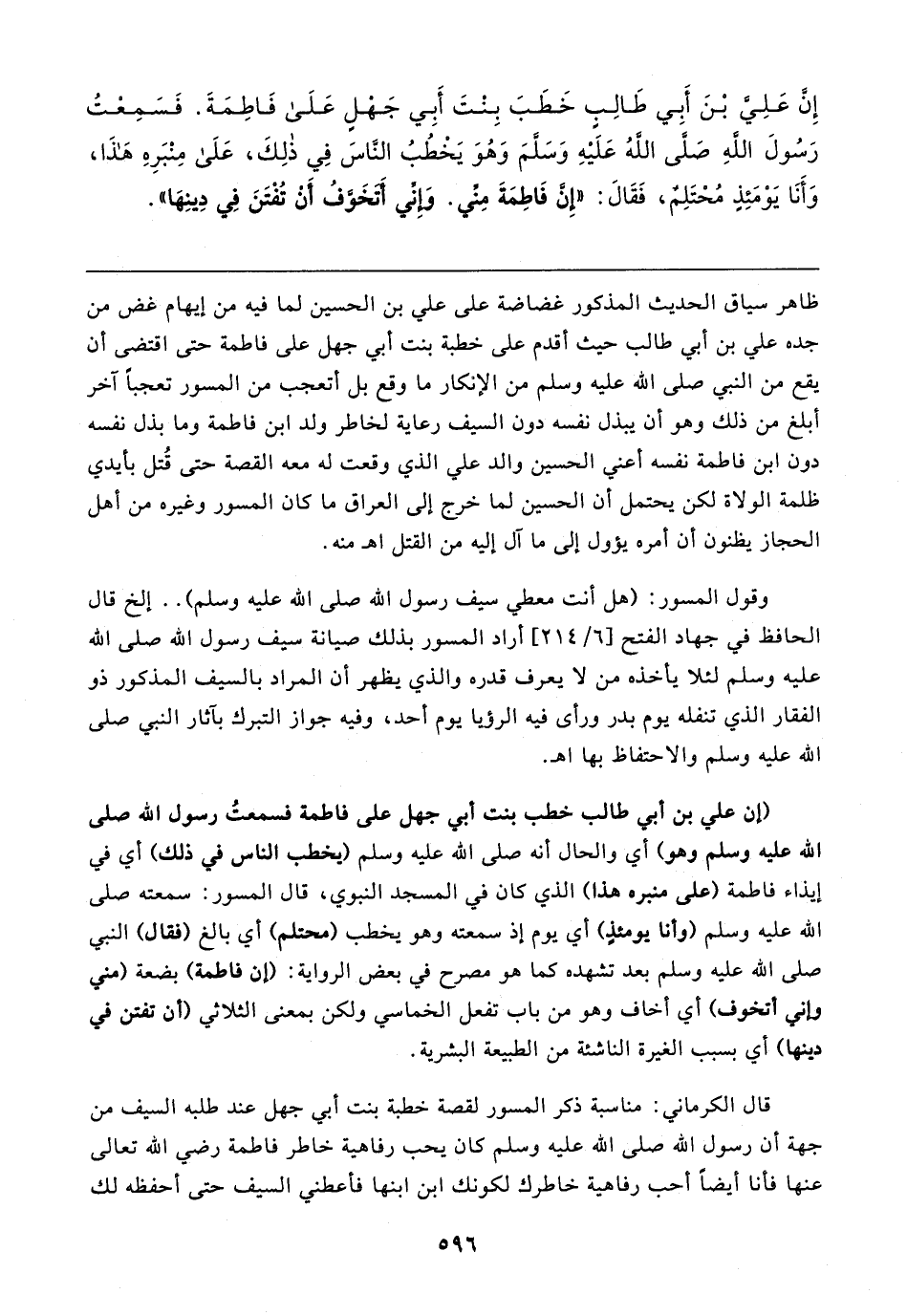ظاهر سياق الحديث المذكور غضاضة على علي بن الحسين لما فيه من إيهام غض من جده علي بن أبي طالب حيث أقدم على خطبة بنت أبي جهل على فاطمة حتى اقتضى أن يقع من النبي صلى الله عليه وسلم من الإنكار ما وقع بل أتعجب من المسور تعجبًا آخر أبلغ من ذلك وهو أن يبذل نفسه دون السيف رعاية لخاطر ولد ابن فاطمة وما بذل نفسه دون ابن فاطمة نفسه أعني الحسين والد علي الذي وقعت له معه القصة حتى قُتل بأيدي ظلمة الولاة لكن يحتمل أن الحسين لما خرج إلى العراق ما كان المسور وغيره من أهل الحجاز يظنون أن أمره يؤول إلى ما آل إليه من القتل اهـ منه.