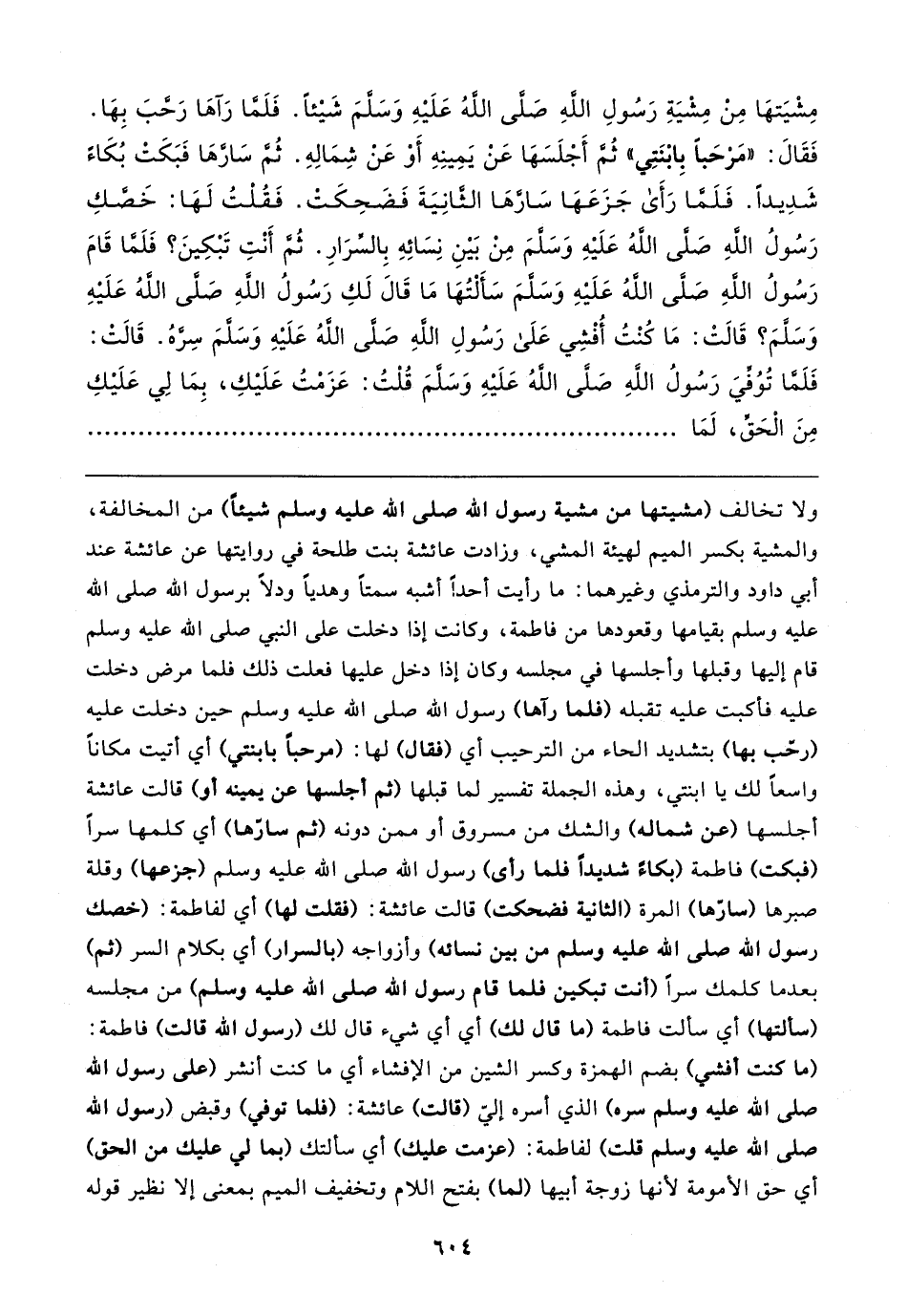 مِشْيَتهَا مِنْ مِشْيَةِ رَسُولِ اللهِ صَلَّى اللهُ عَلَيهِ وَسَلَّمَ شَيئًا. فَلَمَّا رَآهَا رَحَّبَ بِهَا. فَقَال: "مَرْحَبًا بِابْنَتِي" ثُمَّ أَجْلَسَهَا عَنْ يَمِينِهِ أَوْ عَنْ شِمَالِهِ. ثُمَّ سَارَّهَا فَبَكَتْ بُكَاءً شَدِيدًا. فَلَمَّا رَأَى جَزَعَهَا سَارَّهَا الثَّانِيَةَ فَضَحِكَت. فَقُلْتُ لَهَا: خَصَّكِ رَسُولُ اللهِ صَلَّى اللهُ عَلَيهِ وَسَلَّمَ مِنْ بَينِ نِسَائِهِ بِالسِّرَارِ. ثُمَّ أَنْتِ تَبْكِينَ؟ فَلَمَّا قَامَ رَسُولُ اللهِ صَلَّى اللهُ عَلَيهِ وَسَلَّمَ سَأَلْتُهَا مَا قَال لَكِ رَسُولُ اللهِ صَلَّى اللهُ عَلَيهِ وَسَلَّمَ؟ قَالتْ: مَا كُنْتُ أُفْشِي عَلَى رَسُولِ اللهِ صَلَّى اللهُ عَلَيهِ وَسَلَّمَ سِرَّهُ. قَالت: فَلَمَّا تُوُفِّيَ رَسُولُ اللهِ صَلَّى اللهُ عَلَيهِ وَسَلَّمَ قُلْتُ: عَزَمْتُ عَلَيكِ، بِمَا لِي عَلَيكِ مِنَ الْحَق، لَمَا