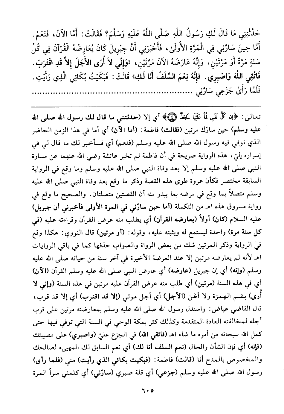 تعالى: {إِنْ كُلُّ نَفْسٍ لَمَّا عَلَيهَا حَافِظٌ (٤)} أي إلا (حدثثني ما قال لك رسول الله صلى الله عليه وسلم) حين سارّك مرتين (فقالت) فاطمة: (أما الآن) أي أما في هذا الزمن الحاضر الذي توفي فيه رسول الله صلى الله عليه وسلم (فنعم) أي فسأخبر لك ما قال لي في إسراره إليّ، هذه الرواية صريحة في أن فاطمة لم تخبر عائشة رضي الله عنهما عن مسارة النبي صلى الله عليه وسلم إلا بعد وفاة النبي صلى الله عليه وسلم وما وقع في الرواية السابقة مختصر فكأن عروة طوى هذه القصة وذكر ما وقع بعد وفاة النبي صلى الله عليه وسلم متصلًا بما وقع في مرضه بما يبدو منه أن القصتين متصلتان، والصحيح ما وقع في رواية مسروق هذه اهـ من التكملة (أما حين سارّني في المرة الأولى فأخبرني أن جبريل) - عليه السلام - كان) أولًا (يعارضه القرآن) أي يطلب منه عرض القرآن وقراءته عليه (في كل سنة مرة) واحدة ليستمع له ويثبته عليه، وقوله: (أو مرتين) قال النووي: هكذا وقع في الرواية وذكر المرتين شك من بعض الرواة والصواب حذفها كما في باقي الروايات اهـ لأنه لم يعارضه مرتين إلا عند العرضة الأخيرة في آخر سنة من حياته صلى الله عليه وسلم (وإنه) أي إن جبريل (عارضه) أي عارض النبي صلى الله عليه وسلم القرآن (الآن) أي في هذه السنة (مرتين) أي طلب منه عرض القرآن عليه مرتين في هذه السنة (وإني لا أُرى) بضم الهمزة ولا أظن (الأجل) أي أجل موتي (إلا قد اقترب) أي إلا قد قرب، قال القاضي عياض: واستدل رسول الله صلى الله عليه وسلم بمعارضته مرتين على قرب أجله لمخالفته العادة المتقدمة وكذلك كثر بمكة الوحي في السنة التي توفي فيها حتى كمل الله سبحانه من أمره ما شاء اهـ (فاتقي الله) في الجزع عليّ (واصبري) على مصيبتك (فإنه) أي فإن الشأن والحال (نعم السلف أنا لك) أي نعم السابق لك المهيئ لصالحك والمخصوص بالمدح أنا (قالت) فاطمة: (فبكيت بكائي الدي رأيت) مني (فلما رأى) رسول الله صلى الله عليه وسلم (جزعي) أي قلة صبري (سارّني) أي كلمني سرًّا المرة
