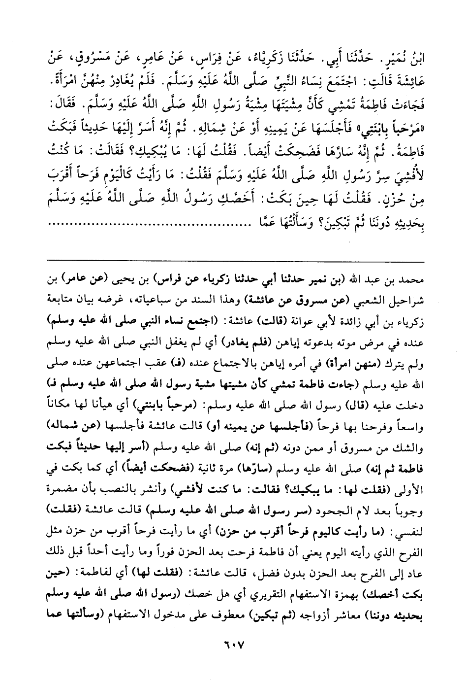 ابْنُ نُمَيرٍ. حَدَّثَنَا أَبِي. حَدَّثَنَا زَكَرِيَّاءُ، عَنْ فِرَاسٍ، عَنْ عَامِرٍ، عَنْ مَسْرُوقٍ، عَنْ عَائِشَةَ قَالتِ: اجْتَمَعَ نِسَاءُ النَّبِيِّ صَلَّى اللهُ عَلَيهِ وَسَلَّمَ. فَلَمْ يُغَادِرْ مِنْهُنَّ امْرَأةً. فَجَاءَتْ فَاطِمَةُ تَمْشِي كَأَنَّ مِشْيَتَهَا مِشْيَةُ رَسُولِ اللهِ صَلَّى اللهُ عَلَيهِ وَسَلَّمَ. فَقَال: "مَرْحَبًا بِابْنَتِي" فَأجْلَسَهَا عَنْ يَمِينِهِ أَوْ عَنْ شِمَالِهِ. ثُمَّ إِنَّهُ أَسَرَّ إِلَيهَا حَدِيثًا فَبَكَتْ فَاطِمَةُ. ثُمَّ إِنَّهُ سَارَّهَا فَضَحِكَتْ أَيضًا. فَقُلْتُ لَهَا: مَا يُبْكِيكِ؟ فَقَالتْ: مَا كُنْتُ لأفْشِيَ سِرَّ رَسُولِ اللهِ صَلَّى اللهُ عَلَيهِ وَسَلَّمَ فَقُلْتُ: مَا رَأَيتُ كَالْيَوْمِ فَرَحًا أَقرَبَ مِنْ حُزْنٍ. فَقُلْتُ لَهَا حِينَ بَكَتْ: أَخَصَّكِ رَسُولُ اللهِ صَلَّى اللهُ عَلَيهِ وَسَلَّمَ بِحَدِيثِهِ دُونَنَا ثُمَّ تَبْكِينَ؟ وَسَألْتُهَا عَمَّا