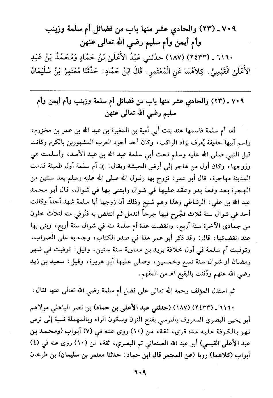 ٧٠٩ - (٢٣) والحادي عشر منها باب من فضائل أم سلمة وزينب وأم أيمن وأم سليم رضي الله تعالى عنهن