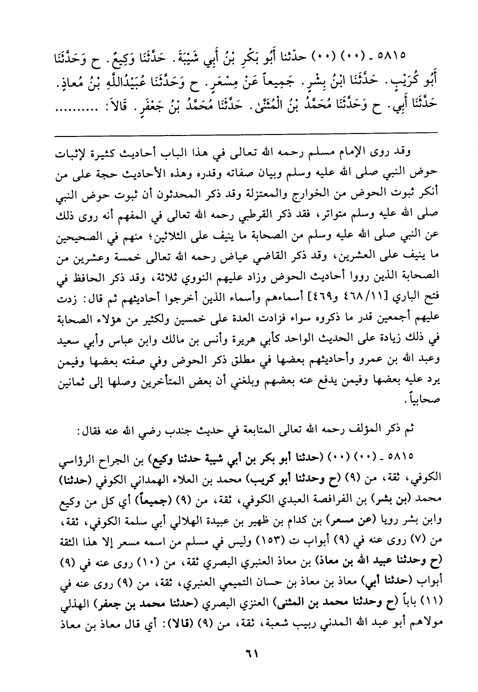 وقد روى الإمام مسلم رحمه الله تعالى في هذا الباب أحاديث كثيرة لإثبات حوض النبي صلى الله عليه وسلم وبيان صفاته وقدره وهذه الأحاديث حجة على من أنكر ثبوت الحوض من الخوارج والمعتزلة وقد ذكر المحدثون أن ثبوت حوض النبي صلى الله عليه وسلم متواتر، فقد ذكر القرطبي رحمه الله تعالى في المفهم أنَّه روى ذلك عن النبي صلى الله عليه وسلم من الصحابة ما ينيف على الثلاثين؛ منهم في الصحيحين ما ينيف على العشرين، وقد ذكر القاضي عياض رحمه الله تعالى خمسة وعشرين من الصحابة الذين رووا أحاديث الحوض وزاد عليهم النووي ثلاثة، وقد ذكر الحافظ في فتح الباري [١١/ ٤٦٨ و ٤٦٩] أسماءهم وأسماء الذين أخرجوا أحاديثهم ثم قال: زدت عليهم أجمعين قدر ما ذكروه سواء فزادت العدة على خمسين ولكثير من هؤلاء الصحابة في ذلك زيادة على الحديث الواحد كأبي هريرة وأنس بن مالك وابن عباس وأبي سعيد وعبد الله بن عمرو وأحاديثهم بعضها في مطلق ذكر الحوض وفي صفته بعضها وفيمن يرد عليه بعضها وفيمن يدفع عنه بعضهم وبلغني أن بعض المتأخرين وصلها إلى ثمانين صحابيًّا.