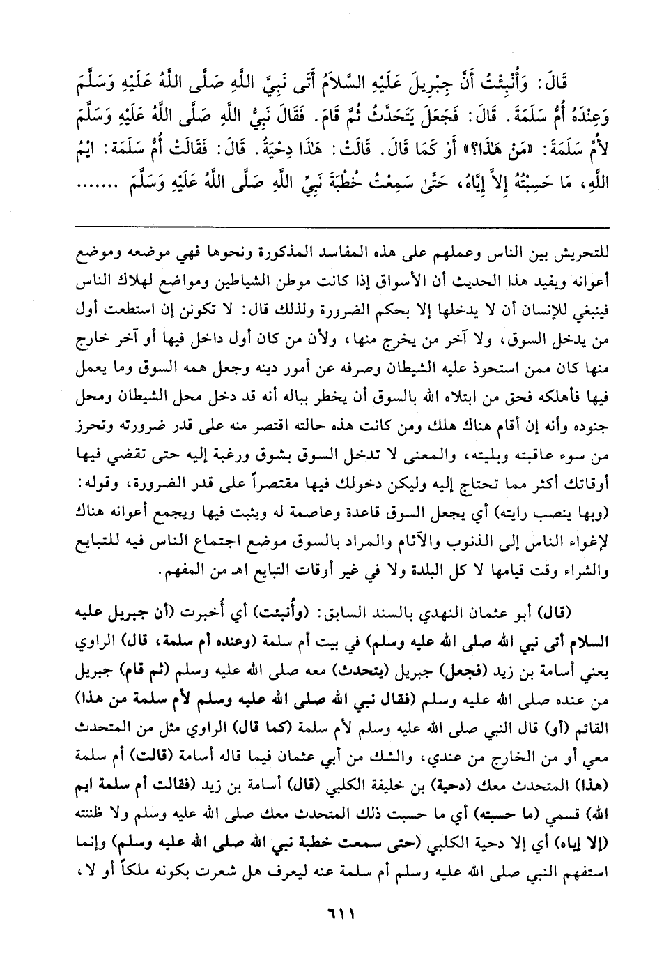 قَال: وَأُنْبِئْتُ أَنَّ جِبْرِيلَ عَلَيهِ السَّلامُ أَتَى نَبِيَّ اللهِ صَلَّى اللهُ عَلَيهِ وَسَلَّمَ وَعِنْدَهُ أُمُّ سَلَمَةَ. قَال: فَجَعَلَ يَتَحَدَّثُ ثُمَّ قَامَ. فَقَال نَبِيُّ اللهِ صَلَّى اللهُ عَلَيهِ وَسَلَّمَ لأُمِّ سَلَمَةَ: "مَنْ هذَا؟ " أَوْ كَمَا قَال. قَالت: هَذَا دِحْيَةُ. قَال: فَقَالتْ أُمُّ سَلَمَة: ايمُ اللهِ، مَا حَسِبْتُهُ إلا إِيَّاهُ، حَتَّى سَمِعْتُ خُطْبَةَ نَبِيِّ اللهِ صَلَّى اللهُ عَلَيهِ وَسَلَّمَ