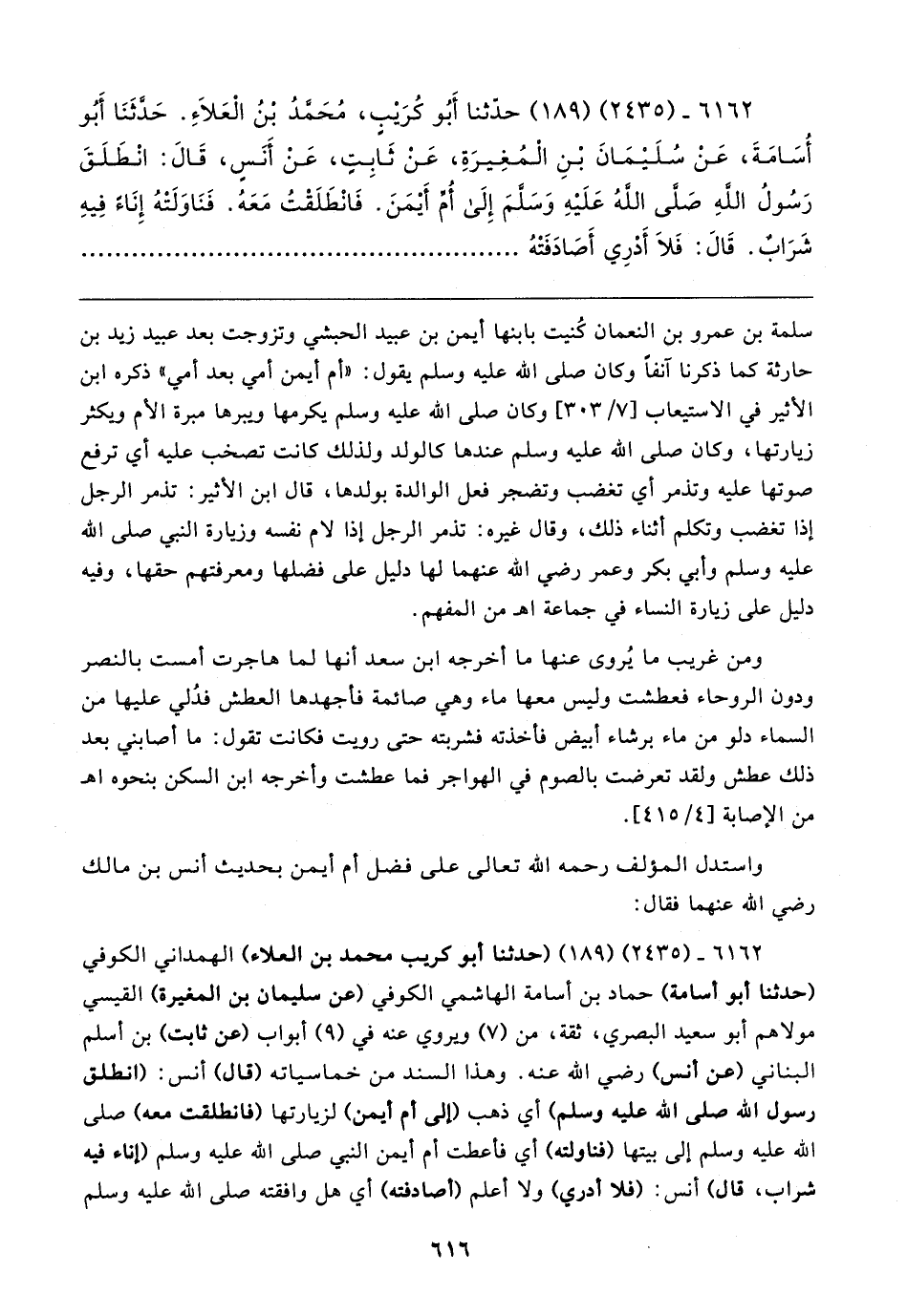 ٦١٦٢ - (٢٤٣٥) (١٨٩) حدَّثنا أَبُو كُرَيبٍ، مُحَمَّدُ بْنُ الْعَلاءِ. حَدَّثَنَا أَبُو أُسَامَةَ، عَنْ سُلَيمَانَ بْنِ الْمُغِيرَةِ، عَنْ ثَابِتٍ، عَنْ أَنَسٍ، قَال: انْطَلَقَ رَسُولُ اللهِ صَلَّى اللهُ عَلَيهِ وَسَلَّمَ إِلَى أُمِّ أَيمَنَ. فَانْطَلَقْتُ مَعَهُ. فَنَاوَلَتْهُ إِنَاءً فِيهِ شَرَابٌ. قَال: فَلَا أَدْرِي أَصَادَفَتْهُ