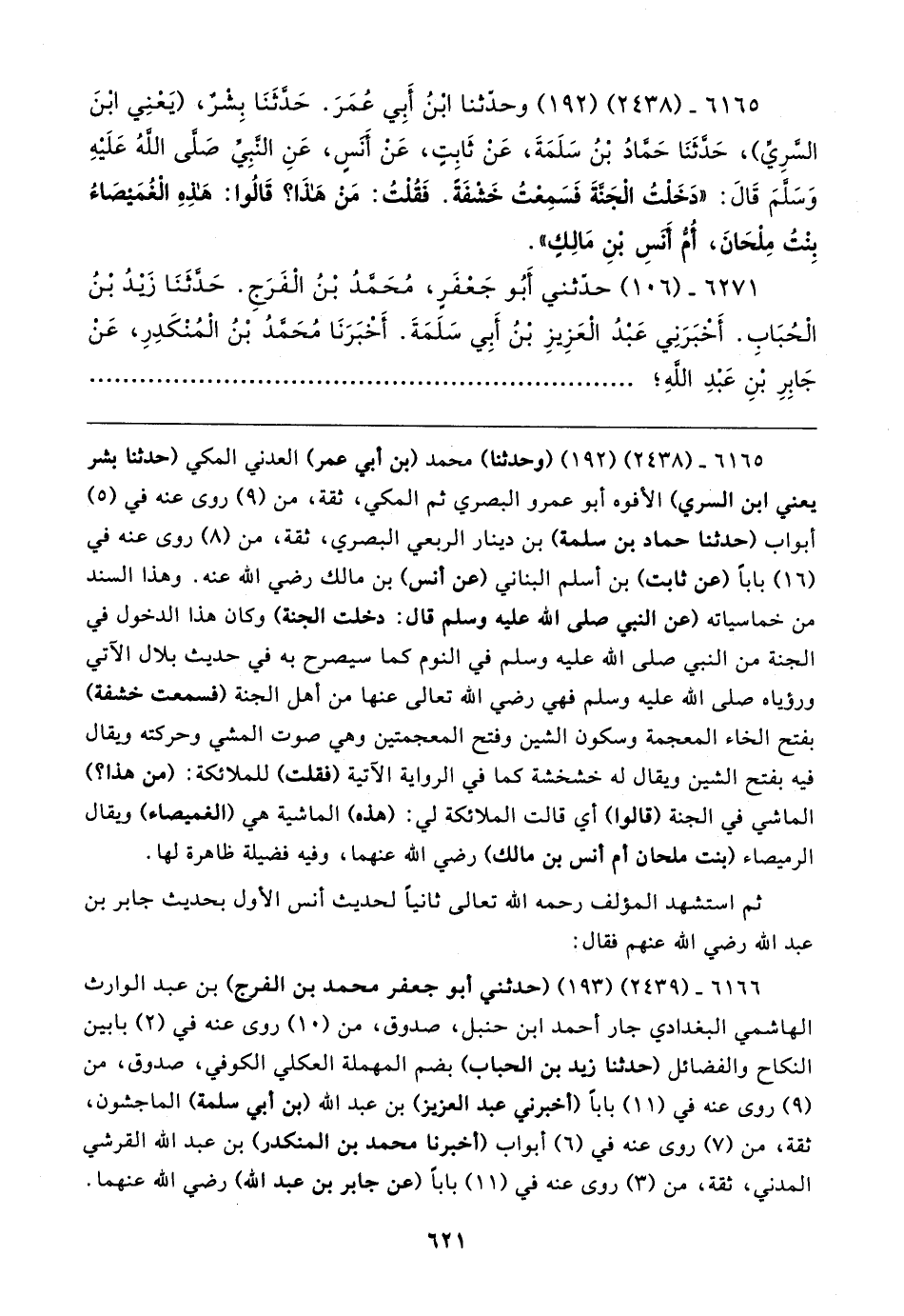 ٦١٦٥ - (٢٤٣٨) (١٩٢) وحدّثنا ابْنُ أَبِي عُمَرَ. حَدَّثَنَا بِشْرٌ، (يَعْنِي ابْنَ السَّرِيِّ)، حَدَّثَنَا حَمَّادُ بْنُ سَلَمَةَ، عَنْ ثَابِتٍ، عَنْ أَنسٍ، عَنِ النَّبِيِّ صَلَّى اللهُ عَلَيهِ وَسَلَّمَ قَال: "دَخَلْتُ الْجَنَّةَ فَسَمِعْتُ خَشفَةَ. فَقُلْتُ: مَنْ هذَا؟ قَالُوا: هذِهِ الْغُمَيصَاءُ بِنْتُ مِلْحَانَ، أُمُّ أنسِ بْنِ مَالِكٍ".