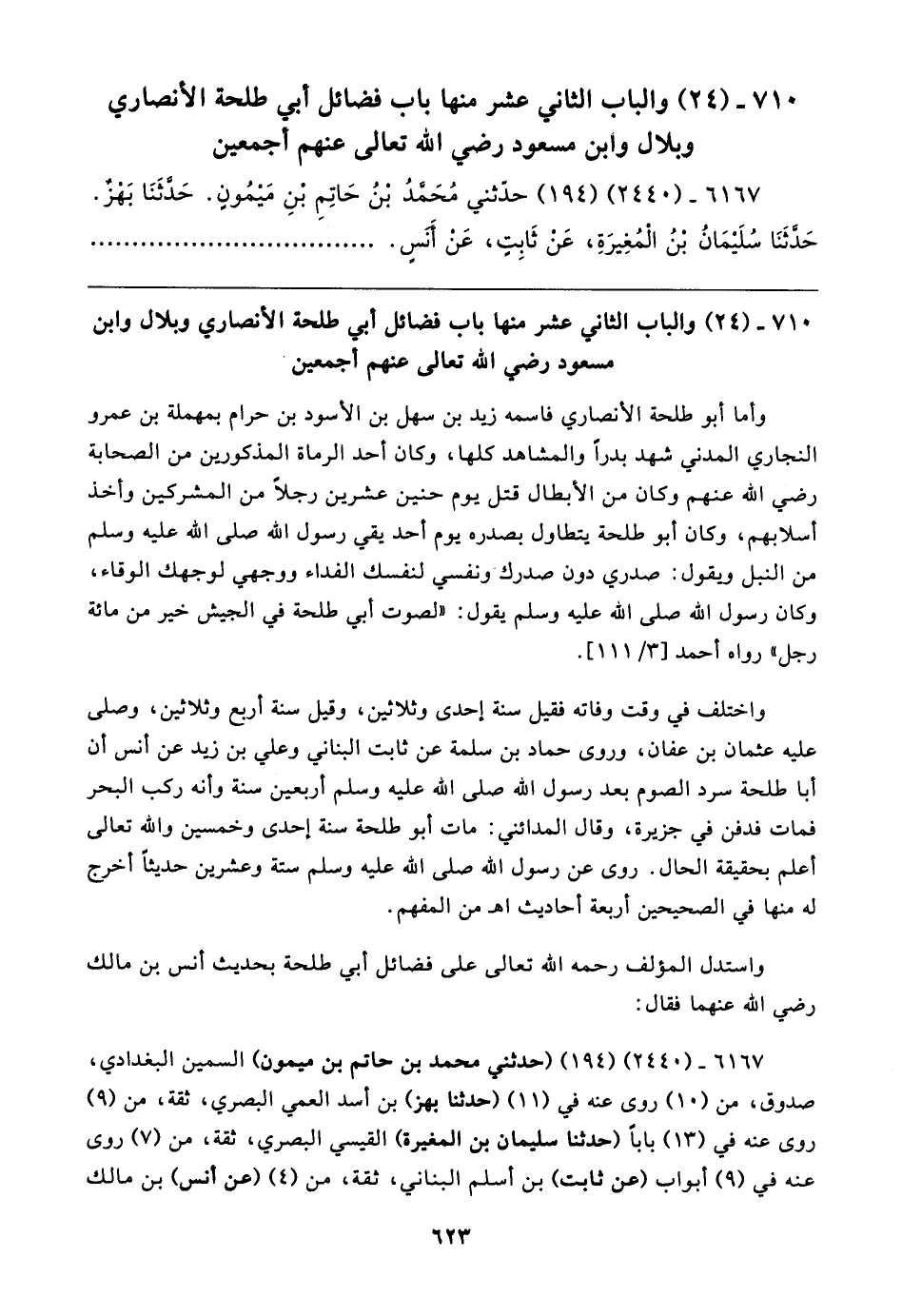 ٧١٠ - (٢٤) والباب الثاني عشر منها باب فضائل أبي طلحة الأنصاري وبلال وابن مسعود رضي الله تعالى عنهم أجمعين