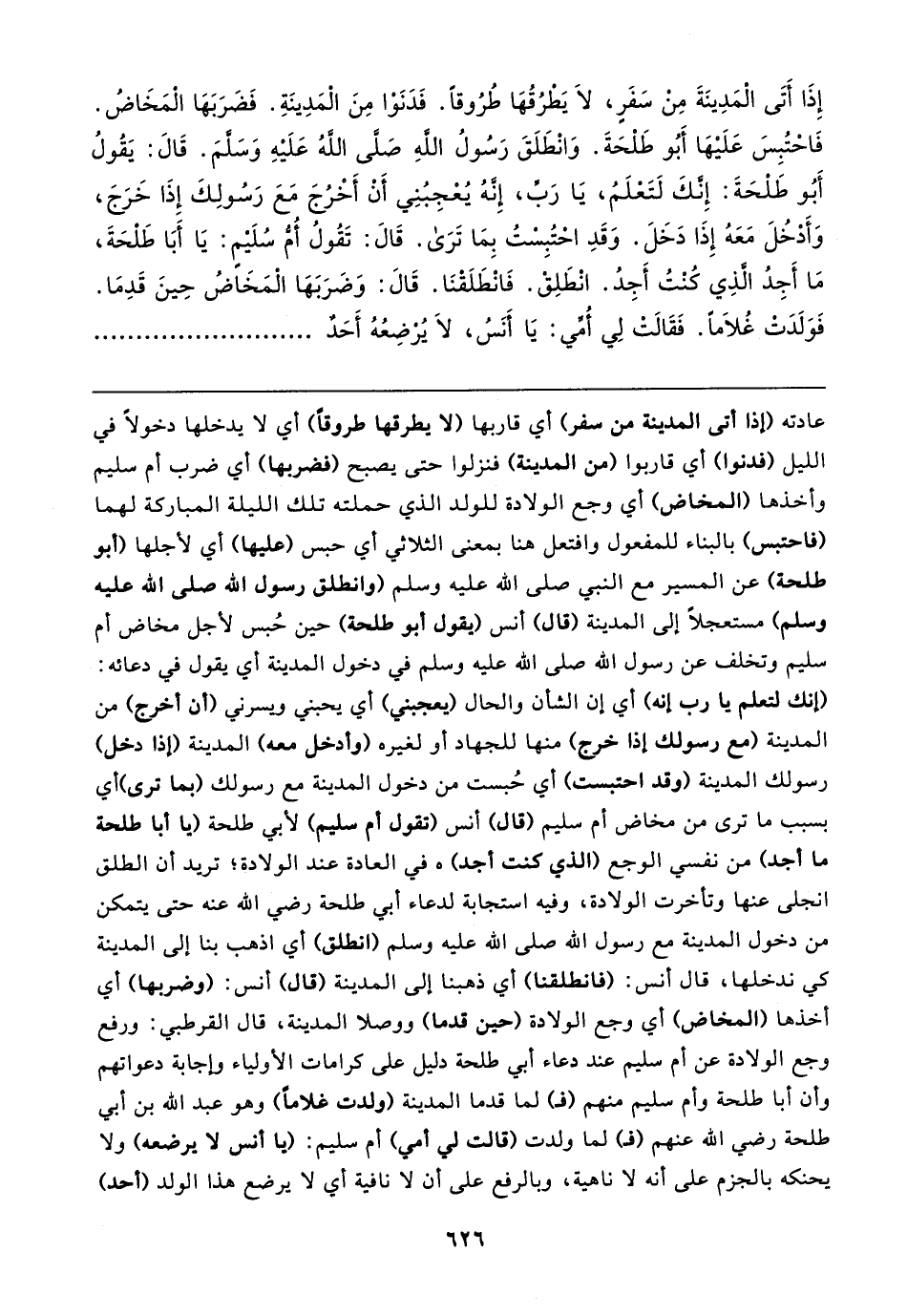 إِذَا أَتَى الْمَدِينَةَ مِنْ سَفَرٍ، لَا يَطرُقُهَا طُرُوقًا. فَدَنَوْا مِنَ الْمَدِينَةِ. فَضَرَبَهَا الْمَخَاضُ. فَاحْتُبِسَ عَلَيهَا أَبُو طَلْحَةَ. وَانْطَلَقَ رَسُولُ اللهِ صَلَّى اللهُ عَلَيهِ وَسَلَّمَ. قَال: يَقُولُ أَبُو طَلْحَةَ: إِنَّكَ لَتَعْلَمُ، يَا رَبِّ، إِنَّهُ يُعْجِبُنِي أَنْ أَخْرُجَ مَعَ رَسُولِكَ إِذَا خَرَجَ، وَأَدْخُلَ مَعَهُ إِذَا دَخَلَ. وَقَدِ احْتُبِسْتُ بِمَا تَرَى. قَال: تَقُولُ أمُّ سُلَيمٍ: يَا أَبَا طَلْحَةَ، مَا أَجِدُ الَّذِي كُنْتُ أَجِدُ. انْطَلِقْ. فَانْطَلَقْنَا. قَال: وَضَرَبَهَا الْمَخَاضُ حِينَ قَدِمَا. فَوَلَدَت غُلامًا. فَقَالتْ لِي أُمِّي: يَا أَنَسُ، لَا يُرْضِعُهُ أَحَدٌ