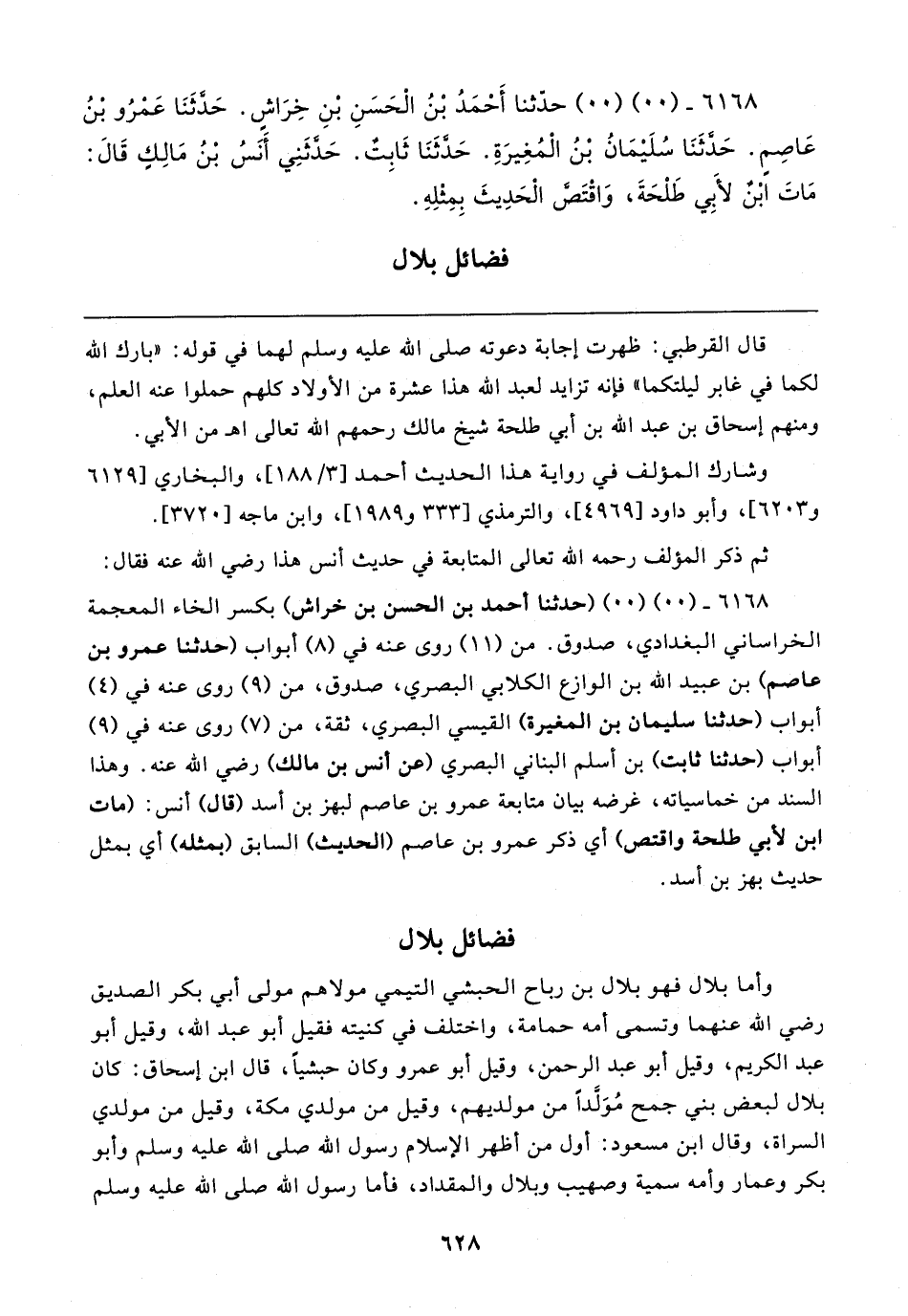 ٦١٦٨ - (٠٠) (٠٠) (حدثنا أحمد بن الحسن بن خراش) بكسر الخاء المعجمة الخراساني البغدادي، صدوق. من (١١) روى عنه في (٨) أبواب (حدثنا عمرو بن عاصم) بن عبيد الله بن الوازع الكلابي البصري، صدوق، من (٩) روى عنه في (٤) أبواب (حدثنا سليمان بن المغيرة) القيسي البصري، ثقة، من (٧) روى عنه في (٩) أبواب (حدثنا ثابت) بن أسلم البناني البصري (عن أنس بن مالك) رضي الله عنه. وهذا السند من خماسياته، غرضه بيان متابعة عمرو بن عاصم لبهز بن أسد (قال) أنس: (مات ابن لأبي طلحة واقتص) أي ذكر عمرو بن عاصم (الحديث) السابق (بمثله) أي بمثل حديث بهز بن أسد.