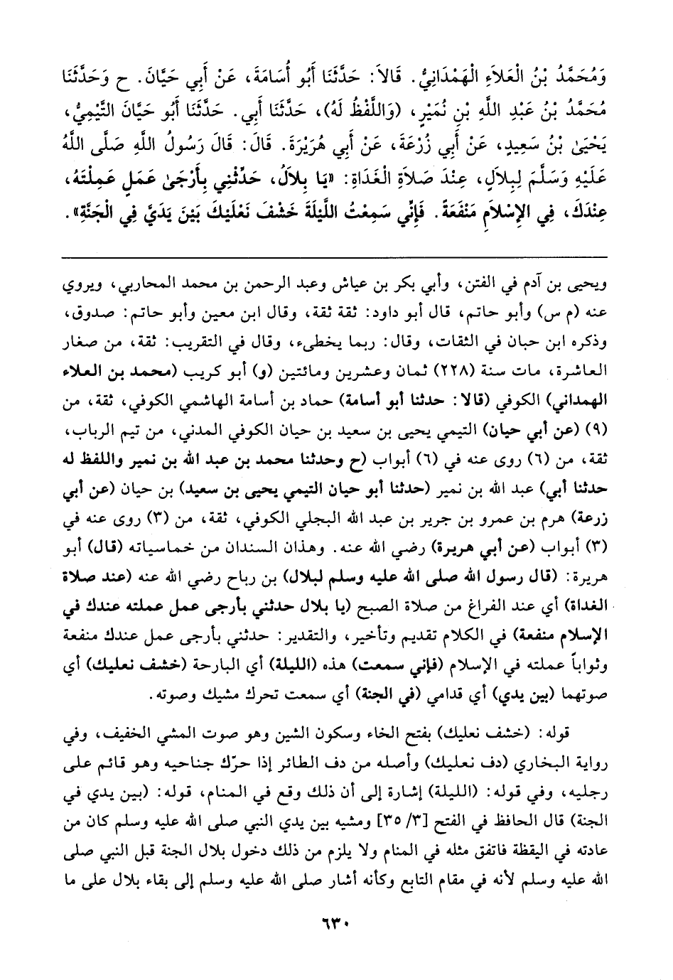 وَمُحَمَّدُ بْنُ الْعَلاءِ الْهَمْدَانِيُّ. قَالا: حَدَّثَنَا أَبُو أُسَامَةَ، عَنْ أَبِي حَيَّانَ. ح وَحَدَّثَنَا مُحَمَّدُ بْنُ عَبْدِ اللهِ بْنِ نُمَيرٍ، (وَاللَّفْظُ لَهُ)، حَدَّثَنَا أَبِي. حَدَّثَنَا أبُو حَيَّانَ التَّيمِيُّ، يَحْيَى بْنُ سَعِيدٍ، عَنْ أَبِي زُرْعَةَ، عَنْ أَبِي هُرَيرَةَ. قَال: قَال رَسُولُ اللهِ صَلَّى اللهُ عَلَيهِ وَسَلَّمَ لِبِلالٍ، عِنْدَ صَلاةِ الْغَدَاةِ: "يَا بِلالُ، حَدِّثْنِي بِأرْجَى عَمَلِ عَمِلْتَهُ، عِنْدَكَ، فِي الإسْلامِ مَنْفَعَةً. فَإِنِّي سَمِعْتُ اللَّيلَةَ خَشْفَ نَعْلَيكَ بَينَ يَدَيَّ فِي الْجَنَّةِ"
