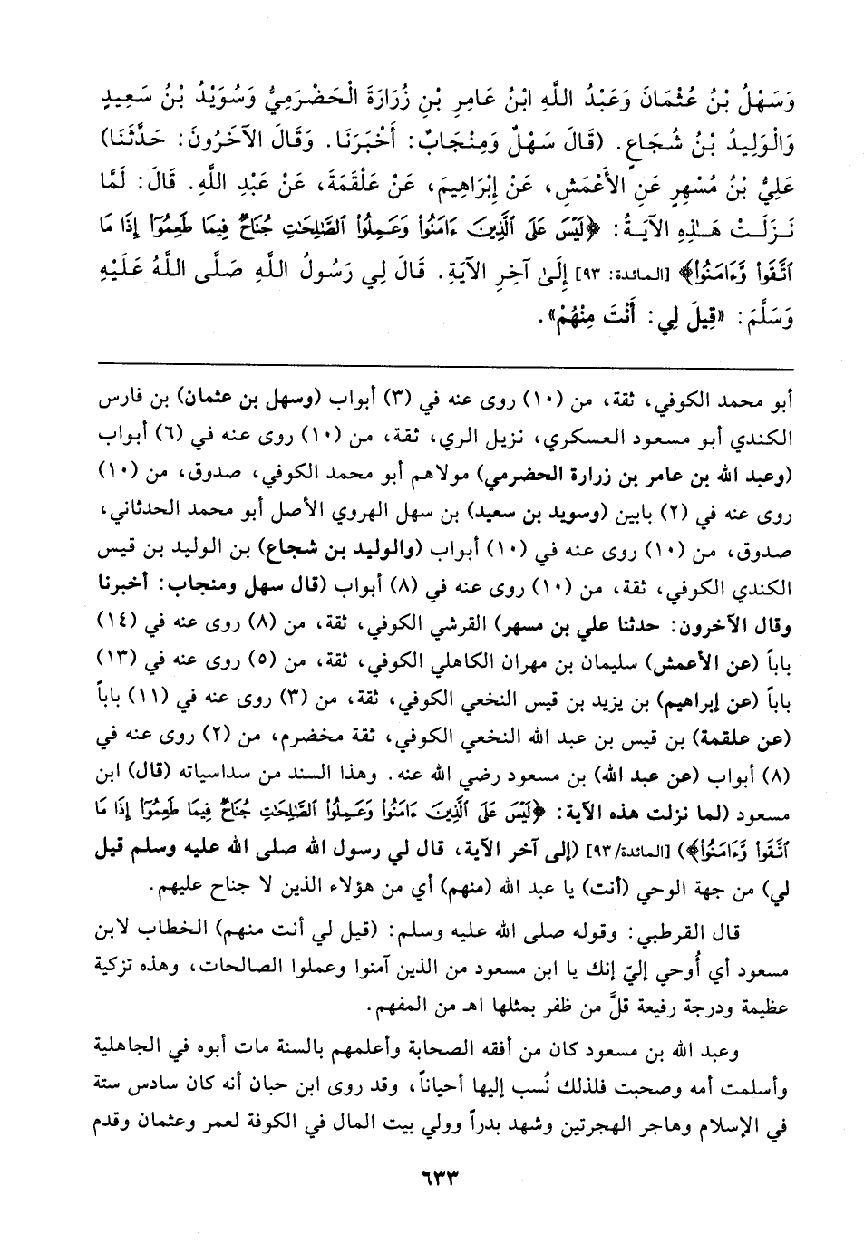 أبو محمد الكوفي، ثقة، من (١٠) روى عنه في (٣) أبواب (وسهل بن عثمان) بن فارس الكندي أبو مسعود العسكري، نزيل الري، ثقة، من (١٠) روى عنه في (٦) أبواب (وعبد الله بن عامر بن زرارة الحضرمي) مولاهم أبو محمد الكوفي، صدوق، من (١٠) روى عنه في (٢) بابين (وسويد بن سعيد) بن سهل الهروي الأصل أبو محمد الحدثاني، صدوق، من (١٠) روى عنه في (١٠) أبواب (والوليد بن شجاع) بن الوليد بن قيس الكندي الكوفي، ثقة، من (١٠) روى عنه في (٨) أبواب (قال سهل ومنجاب: أخبرنا وقال الآخرون: حدثنا علي بن مسهر) القرشي الكوفي، ثقة، من (٨) روى عنه في (١٤) بابا (عن الأعمش) سليمان بن مهران الكاهلي الكوفي، ثقة، من (٥) روى عنه في (١٣) بابا (عن إبراهيم) بن يزيد بن قيس النخعي الكوفي، ثقة، من (٣) روى عنه في (١١) بابا (عن علقمة) بن قيس بن عبد الله النخعي الكوفي، ثقة مخضرم، من (٢) روى عنه في (٨) أبواب (عن عبد الله) بن مسعود رضي الله عنه. وهذا السند من سداسياته (قال) ابن مسعود (لما نزلت هذه الآية: {لَيسَ عَلَى الَّذِينَ آمَنُوا وَعَمِلُوا الصَّالِحَاتِ جُنَاحٌ فِيمَا طَعِمُوا إِذَا مَا اتَّقَوْا وَآمَنُوا} [المائدة: ٩٣] (إلى آخر الآية، قال لي رسول الله صلى الله عليه وسلم قيل لي) من جهة الوحي (أنت) يا عبد الله (منهم) أي من هؤلاء الذين لا جناح عليهم.