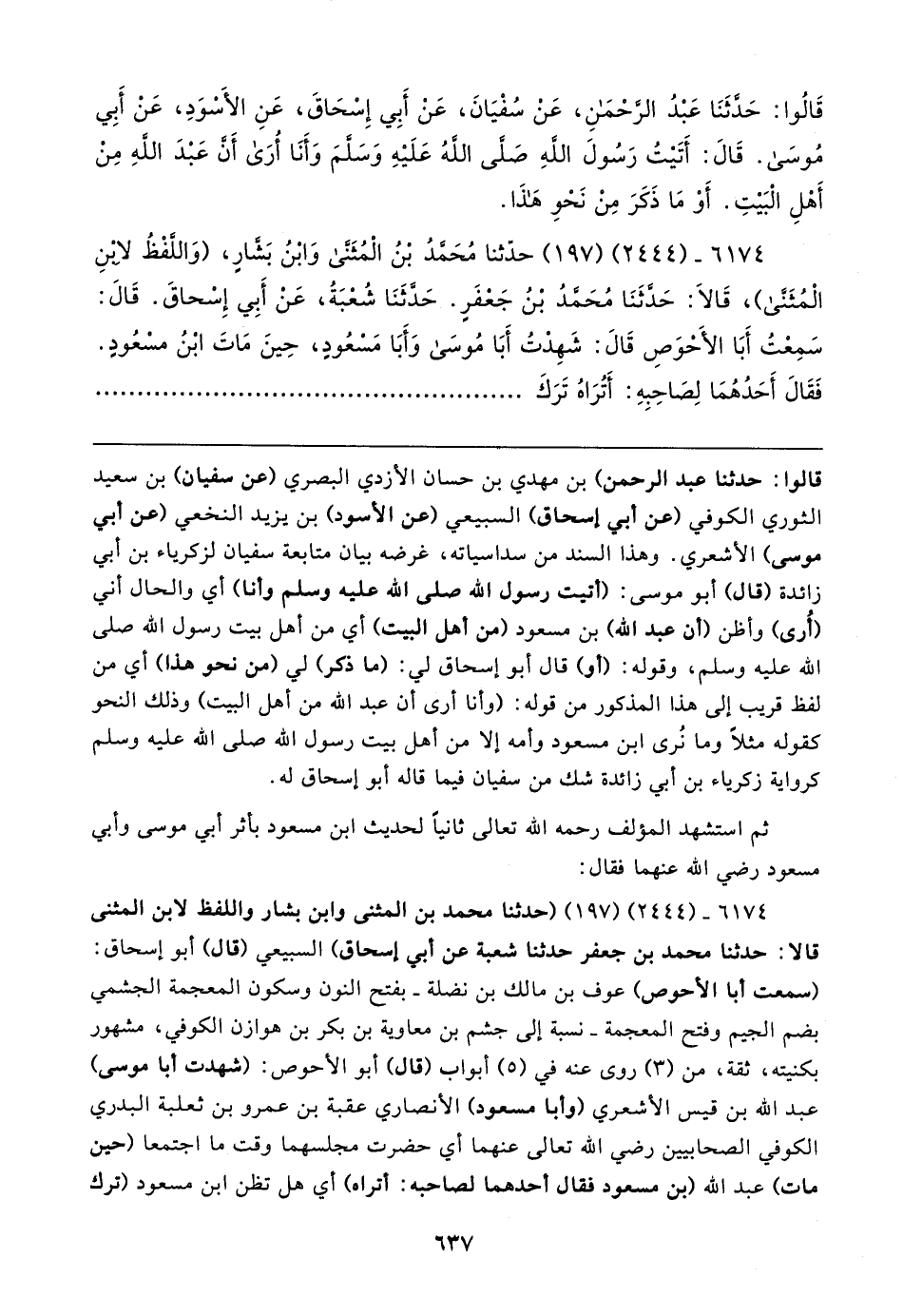 ٦١٧٤ - (٢٤٤٤) (١٩٧) حدَّثنا مُحَمَّدُ بْنُ الْمُثَنَّى وَابْنُ بَشارٍ، (وَاللَّفْظُ لابنِ الْمُثَنَّى)، قَالا: حَدَّثَنَا مُحَمَّدُ بْنُ جَعْفَرٍ. حَدَّثَنَا شُعْبَةُ، عَنْ أَبِي إِسْحاقَ. قَال: سَمِعْتُ أَبَا الأَحْوَصِ قَال: شَهِدْتُ أَبَا مُوسَى وَأَبَا مَسْعُودٍ، حِينَ مَاتَ ابْنُ مسْعُودٍ. فَقَال أَحَدُهُمَا لِصَاحِبِهِ: أَتُرَاهُ تَرَكَ