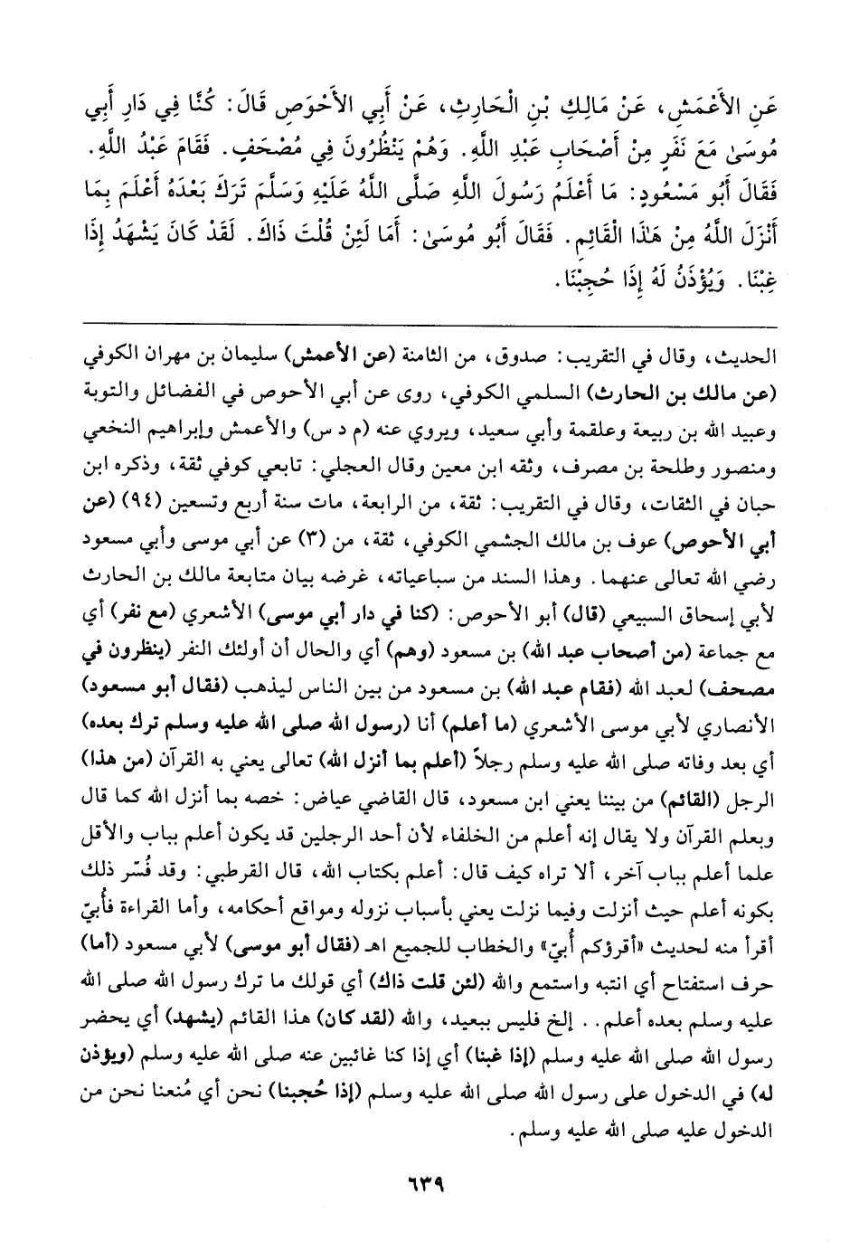 عَنِ الأَعْمَشِ، عَنْ مَالِكِ بْنِ الْحَارِثِ، عَنْ أَبِي الأحوَصِ قَال: كُنَّا فِي دَارِ أبِي مُوسَى مَعَ نَفَرٍ مِنْ أَصْحَابِ عَبْدِ اللهِ. وَهُمْ يَنْظُرُونَ فِي مُصْحَفٍ. فَقَامَ عَبْدُ اللهِ. فَقَال أَبُو مَسْعُودٍ: مَا أَعْلَمُ رَسُولَ اللهِ صَلَّى اللهُ عَلَيهِ وَسَلَّمَ تَرَكَ بَعْدَهُ أَعْلَمَ بِمَا أَنْزَلَ اللهُ مِنْ هَذَا الْقَائِمِ. فَقَال أَبُو مُوسَى: أَمَا لَئِنْ قُلْتَ ذَاكَ. لَقَدْ كَانَ يَشْهَدُ إِذَا غِبْنَا. ويؤْذَنُ لَهُ إِذَا حُجِبْنَا