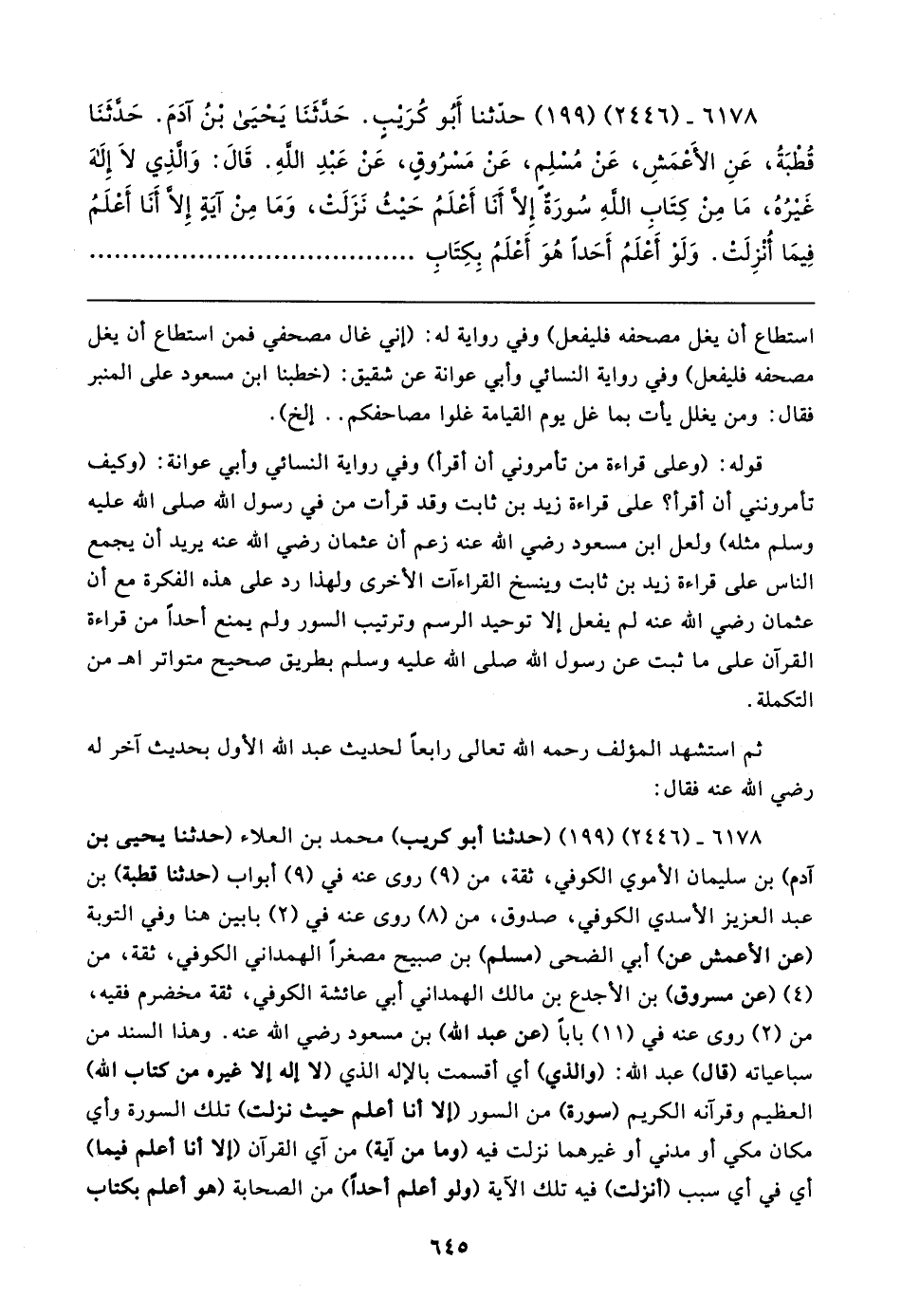 ٦١٧٨ - (٢٤٤٦) (١٩٩) حدَّثنا أَبُو كُرَيبٍ. حَدَّثَنَا يَحْيَى بْنُ آدَمَ. حَدَّثَنَا قُطْبَةُ، عَنِ الأَعْمَشِ، عَنْ مُسلِمٍ، عَنْ مَسرُوقٍ، عَنْ عَبْدِ اللهِ. قَال: وَالَّذِي لَا إِلَهَ غَيرُهُ، مَا مِنْ كِتَابِ اللهِ سُورَةٌ إلا أَنَا أَعْلَمُ حَيثُ نَزَلَتْ، وَمَا مِنْ آيَةٍ إلا أَنَا أَعْلَمُ فِيمَا أُنْزِلَت. وَلَوْ أَعْلَمُ أَحَدًا هُوَ أَعْلَمُ بِكِتَابٍ