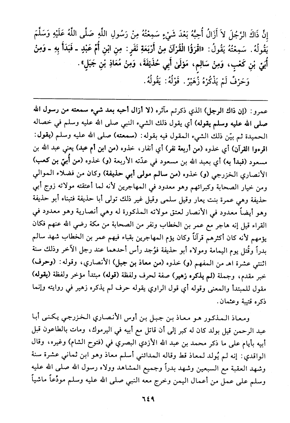 إِنَّ ذَاكَ الرَّجُلَ لَا أَزَالُ أُحِبُّهُ بَعْدَ شَيءٍ سَمِعْتُهُ مِنْ رَسُولِ اللهِ صَلَّى اللهُ عَلَيهِ وَسَلَّمَ يَقُولُهُ. سَمِعْتُهُ يَقُولُ: "اقْرَؤُا الْقُرْآنَ مِنْ أَرْبَعَةِ نَفَرٍ: مِنِ ابْنِ أُمِّ عَبْدٍ -فَبَدَأَ بِهِ- وَمِنْ أُبَيِّ بْنِ كَعْبٍ، وَمِنْ سَالِمٍ، مَوْلَى أَبِي حُذَيفَةَ، وَمِنْ مُعَاذِ بْنِ جَبَلٍ".