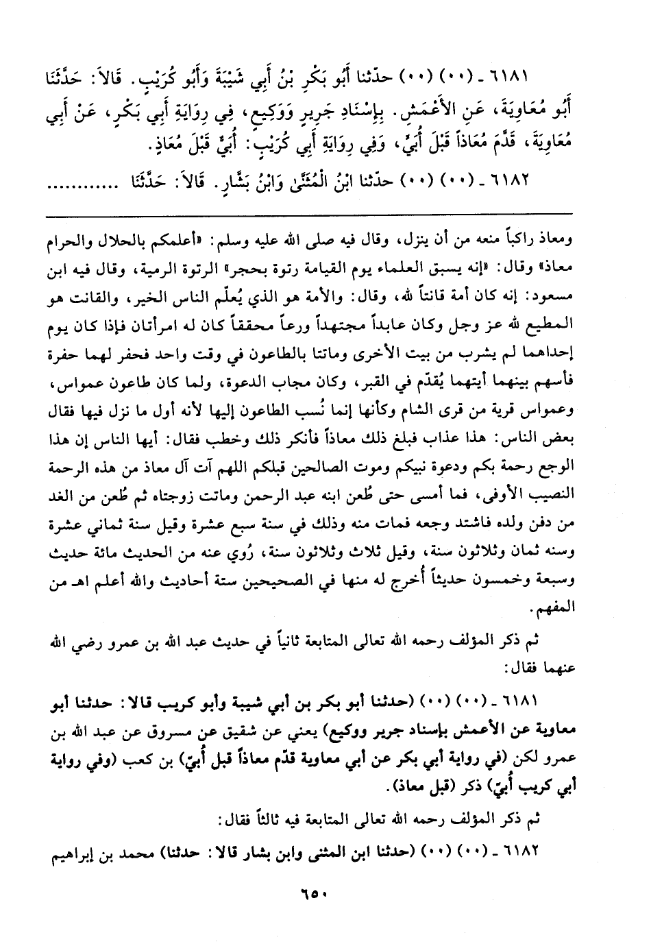 ٦١٨١ - (٠٠) (٠٠) حدَّثنا أَبُو بَكرِ بْنُ أَبِي شَيبَةَ وَأَبُو كُرَيبٍ. قَالا: حَدَّثَنَا أَبُو مُعَاوَيةَ، عَنِ الأَعْمَشِ. بِإسْنَادِ جَرِيرٍ وَوَكِيعٍ، فِي رِوَايَةِ أَبِي بَكرٍ، عَنْ أَبِي مُعَاويَةَ، قَدَّمَ مُعَاذًا قَبْلَ أُبَيٍّ، وَفِي رِوَايَةِ أَبِي كُرَيبٍ: أُبَيٌّ قَبْلَ مُعَاذٍ.