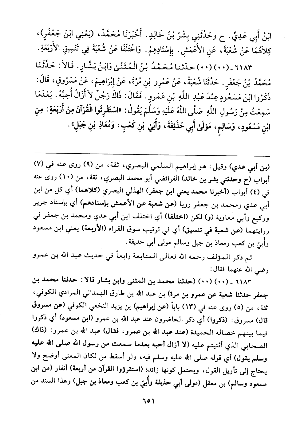 ٦١٨٣ - (٠٠) (٠٠) (حدثنا محمد بن المثنى وابن بشار قالا: حدثنا محمد بن جعفر حدثنا شعبة عن عمرو بن مرة) بن عبد الله بن طارق الهمداني المرادي الكوفي، ثقة، من (٥) روى عنه في (١٣) بابا (عن إبراهيم) بن يزيد النخعي الكوفي (عن مسروق قال) مسروق: (ذكروا) أي ذكر الحاضرون عند عبد الله بن عمرو (ابن مسعود) أي ذكروا فيما بينهم خصاله الحميدة (عند عبد الله بن عمرو، فقال) عبد الله بن عمرو: (ذاك) الصحابي الذي أثنيتم عليه (لا أزال أحبه بعدما سمعت من رسول الله قال الله عليه وسلم يقول) أي قوله صلى الله عليه وسلم فيه، ولو أسقط من لكان المعنى أوضح ولا يحتاج إلى تأويل القول، ويحتمل كونها زائدة (استقرؤوا القرآن من أربعة) أنفار (من ابن مسعود وسالم) بن معقل (مولى أبي حذيفة وأُبيّ بن كعب ومعاذ بن جبل) وهذا السند من