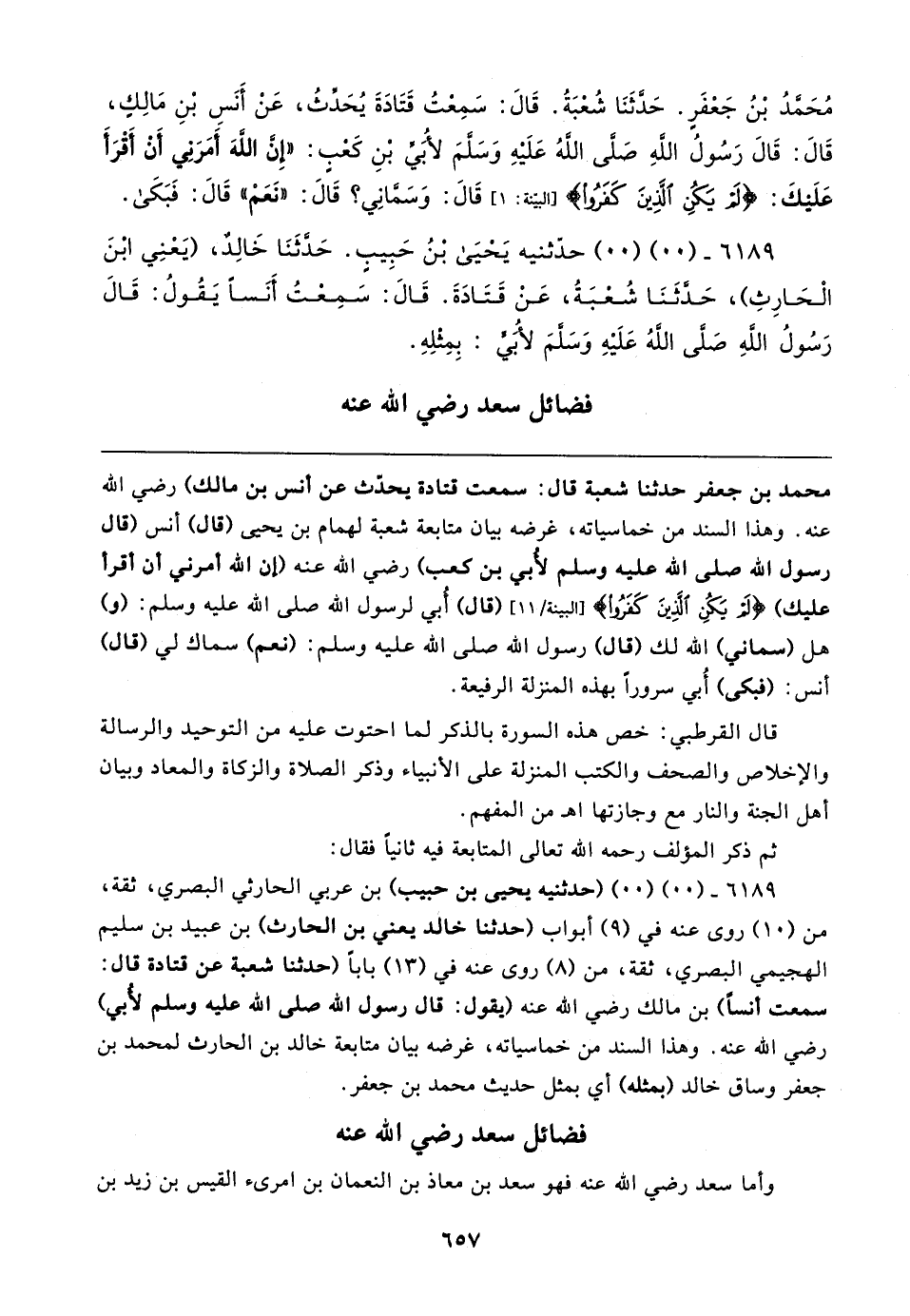 ٦١٨٩ - (٠٠) (٠٠) (حدثنيه يحيى بن حبيب) بن عربي الحارثي البصري، ثقة، من (١٠) روى عنه في (٩) أبواب (حدثنا خالد يعني بن الحارث) بن عبيد بن سليم الهجيمي البصري، ثقة، من (٨) روى عنه في (١٣) بابا (حدثنا شعبة عن قتادة قال: سمعت أنسًا) بن مالك رضي الله عنه (يقول: قال رسول الله صلى الله عليه وسلم لأُبي) رضي الله عنه. وهذا السند من خماسياته، غرضه بيان متابعة خالد بن الحارث لمحمد بن جعفر وساق خالد (بمثله) أي بمثل حديث محمد بن جعفر.