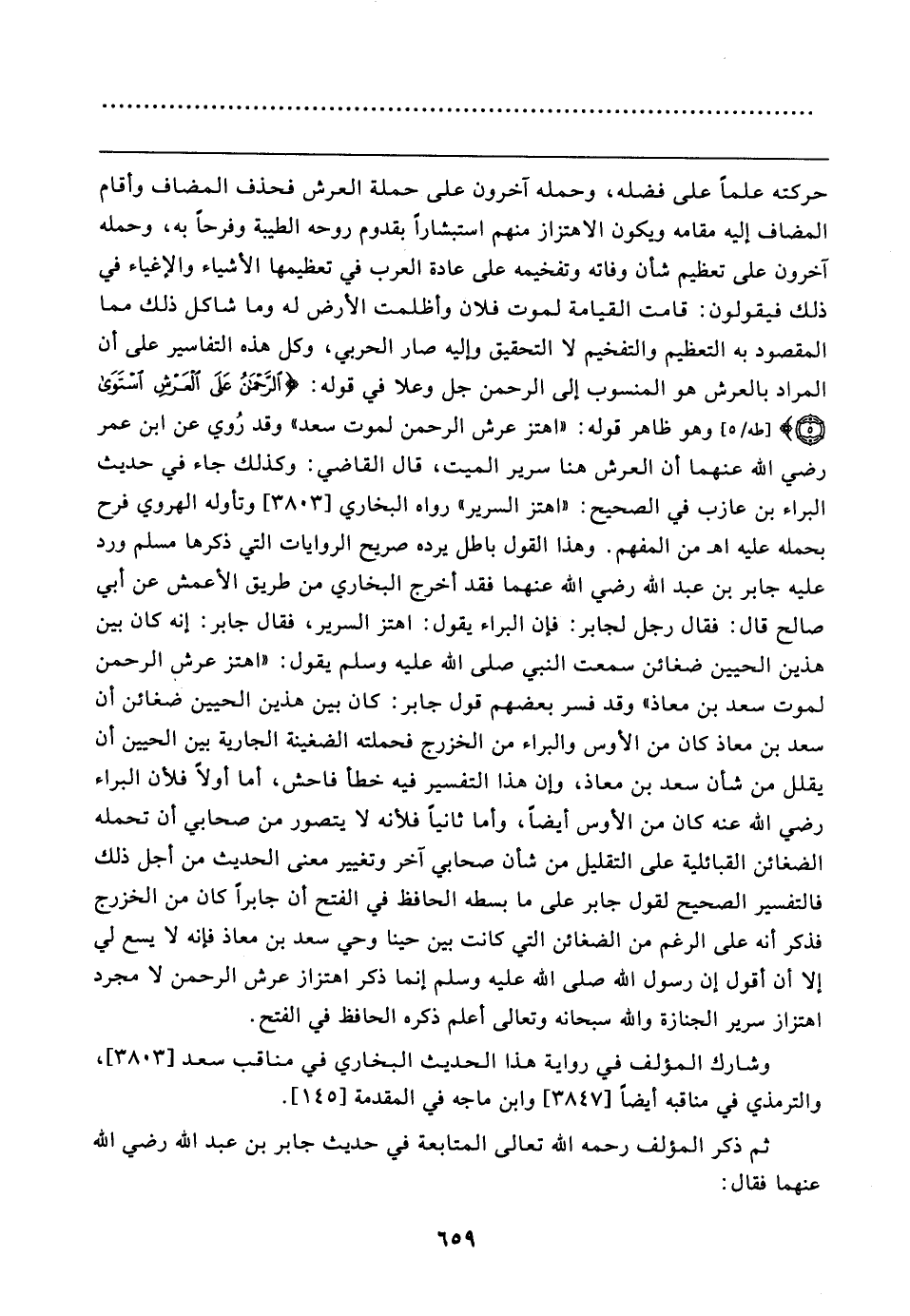 حركته علمًا على فضله، وحمله آخرون على حملة العرش فحذف المضاف وأقام المضاف إليه مقامه ويكون الاهتزاز منهم استبشارًا بقدوم روحه الطيبة وفرحًا به، وحمله آخرون على تعظيم شأن وفاته وتفخيمه على عادة العرب في تعظيمها الأشياء والإغياء في ذلك فيقولون: قامت القيامة لموت فلان وأظلمت الأرض له وما شاكل ذلك مما المقصود به التعظيم والتفخيم لا التحقيق وإليه صار الحربي، وكل هذه التفاسير على أن المراد بالعرش هو المنسوب إلى الرحمن جل وعلا في قوله: {الرَّحْمَنُ عَلَى الْعَرْشِ اسْتَوَى (٥)} [طه / ٥] وهو ظاهر قوله: "اهتز عرش الرحمن لموت سعد" وقد رُوي عن ابن عمر رضي الله عنهما أن العرش هنا سرير الميت، قال القاضي: وكذلك جاء في حديث البراء بن عازب في الصحيح: "اهتز السرير" رواه البخاري [٣٨٠٣] وتأوله الهروي فرح بحمله عليه اهـ من المفهم. وهذا القول باطل يرده صريح الروايات التي ذكرها مسلم ورد عليه جابر بن عبد الله رضي الله عنهما فقد أخرج البخاري من طريق الأعمش عن أبي صالح قال: فقال رجل لجابر: فإن البراء يقول: اهتز السرير، فقال جابر: إنه كان بين هذين الحيين ضغائن سمعت النبي صلى الله عليه وسلم يقول: "اهتز عرش الرحمن لموت سعد بن معاذ" وقد فسر بعضهم قول جابر: كان بين هذين الحيين ضغائن أن سعد بن معاذ كان من الأوس والبراء من الخزرج فحملته الضغينة الجارية بين الحيين أن يقلل من شأن سعد بن معاذ، هان هذا التفسير فيه خطأ فاحش، أما أولًا فلأن البراء رضي الله عنه كان من الأوس أيضًا، وأما ثانيًا فلأنه لا يتصور من صحابي أن تحمله الضغائن القبائلية على التقليل من شأن صحابي آخر وتغيير معنى الحديث من أجل ذلك فالتفسير الصحيح لقول جابر على ما بسطه الحافظ في الفتح أن جابرًا كان من الخزرج فذكر أنه على الرغم من الضغائن التي كانت بين حينا وحي سعد بن معاذ فإنه لا يسع لي إلا أن أقول إن رسول الله صلى الله عليه وسلم إنما ذكر اهتزاز عرش الرحمن لا مجرد اهتزاز سرير الجنازة والله سبحانه وتعالى أعلم ذكره الحافظ في الفتح.