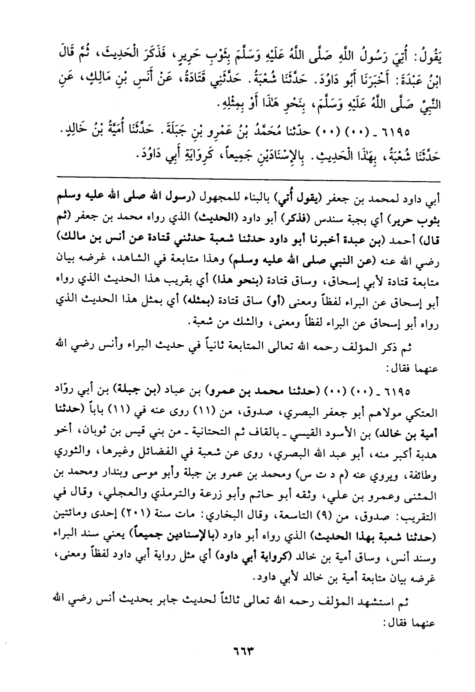 ٦١٩٥ - (٠٠) (٠٠) (حدثنا محمد بن عمرو) بن عباد (بن جبلة) بن أبي روّاد العتكي مولاهم أبو جعفر البصري، صدوق، من (١١) روى عنه في (١١) بابا (حدثنا أمية بن خالد) بن الأسود القيسي -بالقاف ثم التحتانية- من بني قيس بن ثوبان، أخو هدبة أكبر منه، أبو عبد الله البصري، روى عن شعبة في الفضائل وغيرها، والثوري وطائفة، ويروي عنه (م د ت س) ومحمد بن عمرو بن جبلة وأبو موسى وبندار ومحمد بن المثنى وعمرو بن علي، وثقه أبو حاتم وأبو زرعة والترمذي والعجلي، وقال في التقريب: صدوق، من (٩) التاسعة، وقال البخاري: مات سنة (٢٠١) إحدى ومائتين (حدثنا شعبة بهذا الحديث) الذي رواه أبو داود (بالإسنادين جميعًا) يعني سند البراء وسند أنس، وساق أمية بن خالد (كرواية أبي داود) أي مثل رواية أبي داود لفظًا ومعنى، غرضه بيان متابعة أمية بن خالد لأبي داود.