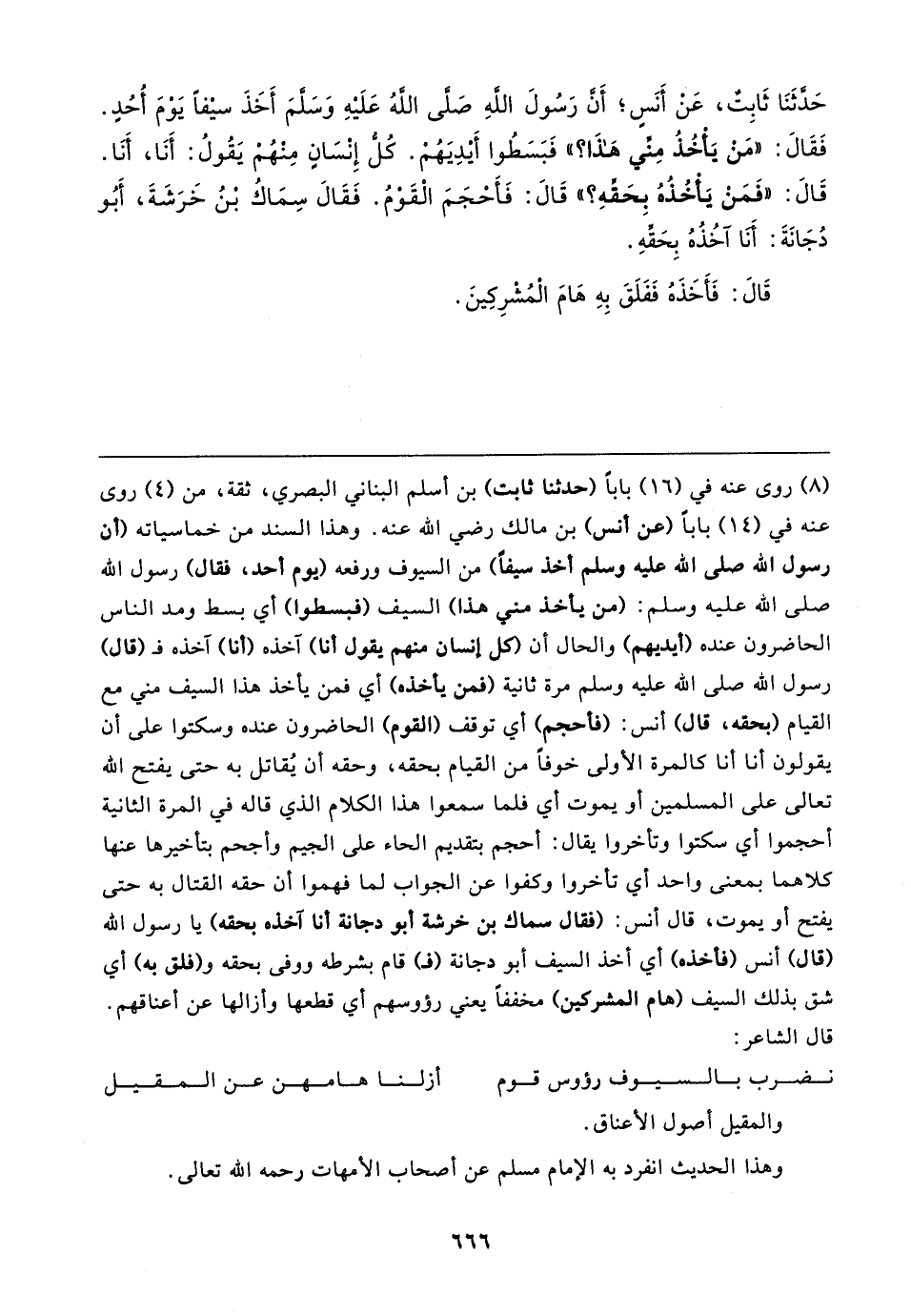 حَدَّثَنَا ثَابِتٌ، عَنْ أَنَسٍ؛ أَنَّ رَسُولَ اللهِ صَلَّى اللهُ عَلَيهِ وَسَلَّمَ أَخَذَ سيفًا يَوْمَ أُحُدٍ. فَقَال: "مَنْ يَأْخُذُ مِنِّي هَذَا؟ " فَبَسَطُوا أَيدِيَهُمْ. كُلُّ إِنْسَانٍ مِنْهُمْ يَقُولُ: أَنَا، أَنَا. قَال: "فَمَنْ يَأْخُذُهُ بِحَقِّهِ؟ " قَال: فَأَحْجَمَ الْقَوْمُ. فَقَال سِمَاكُ بْنُ خَرَشَةَ، أَبُو دُجَانَةَ: أَنَا آخُذُهُ بِحَقِّهِ.