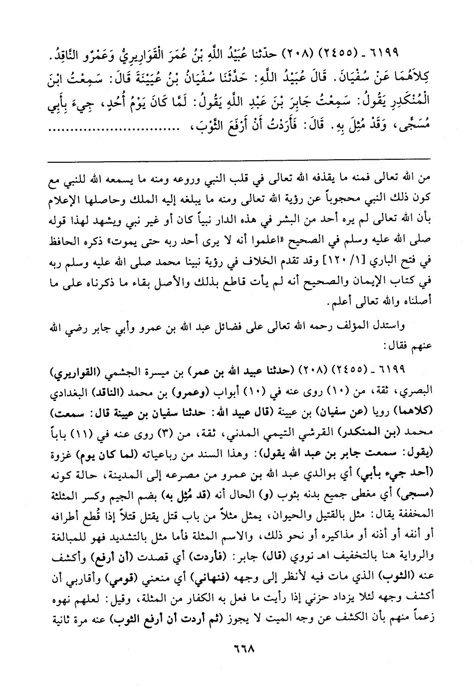 ٦١٩٩ - (٢٤٥٥) (٢٠٨) (حدثنا عبيد الله بن عمر) بن ميسرة الجشمي (القواريري) البصري، ثقة، من (١٠) روى عنه في (١٠) أبواب (وعمرو) بن محمد (الناقد) البغدادي كلاهما) رويا (عن سفيان) بن عيينة (قال عبيد الله: حدثنا سفيان بن عيينة قال: سمعت) محمد (بن المنكدر) القرشي التيمي المدني، ثقة، من (٣) روى عنه في (١١) بابا (يقول: سمعت جابر بن عبد الله يقول): وهذا السند من رباعياته (لما كان يوم) غزوة (أحد جيء بأبي) أي بوالدي عبد الله بن عمرو من مصرعه إلى المدينة، حالة كونه (مسجى) أي مغطى جميع بدنه بثوب (و) الحال أنه (قد مُثِل به) بضم الجيم وكسر المثلثة المخففة يقال: مثل بالقتيل والحيوان، يمثل مثلًا من باب قتل يقتل قتلًا إذا قُطع أطرافه أو أنفه أو أذنه أو مذاكيره أو نحو ذلك، والاسم المثلة فأما مثل بالتشديد فهو للمبالغة والرواية هنا بالتخفيف اهـ نووي (قال) جابر: (فأردت) أي قصدت (أن أرفع) وأكشف عنه (الثوب) الذي مات فيه لأنظر إلى وجهه (فنهاني) أي منعني (قومي) وأقاربي أن أكشف وجهه لئلا يزداد حزني إذا رأيت ما فعل به الكفار من المثلة، وقيل: لعلهم نهوه زعمًا منهم بأن الكشف عن وجه الميت لا يجوز (ثم أردت أن أرفع الثوب) عنه مرة ثانية