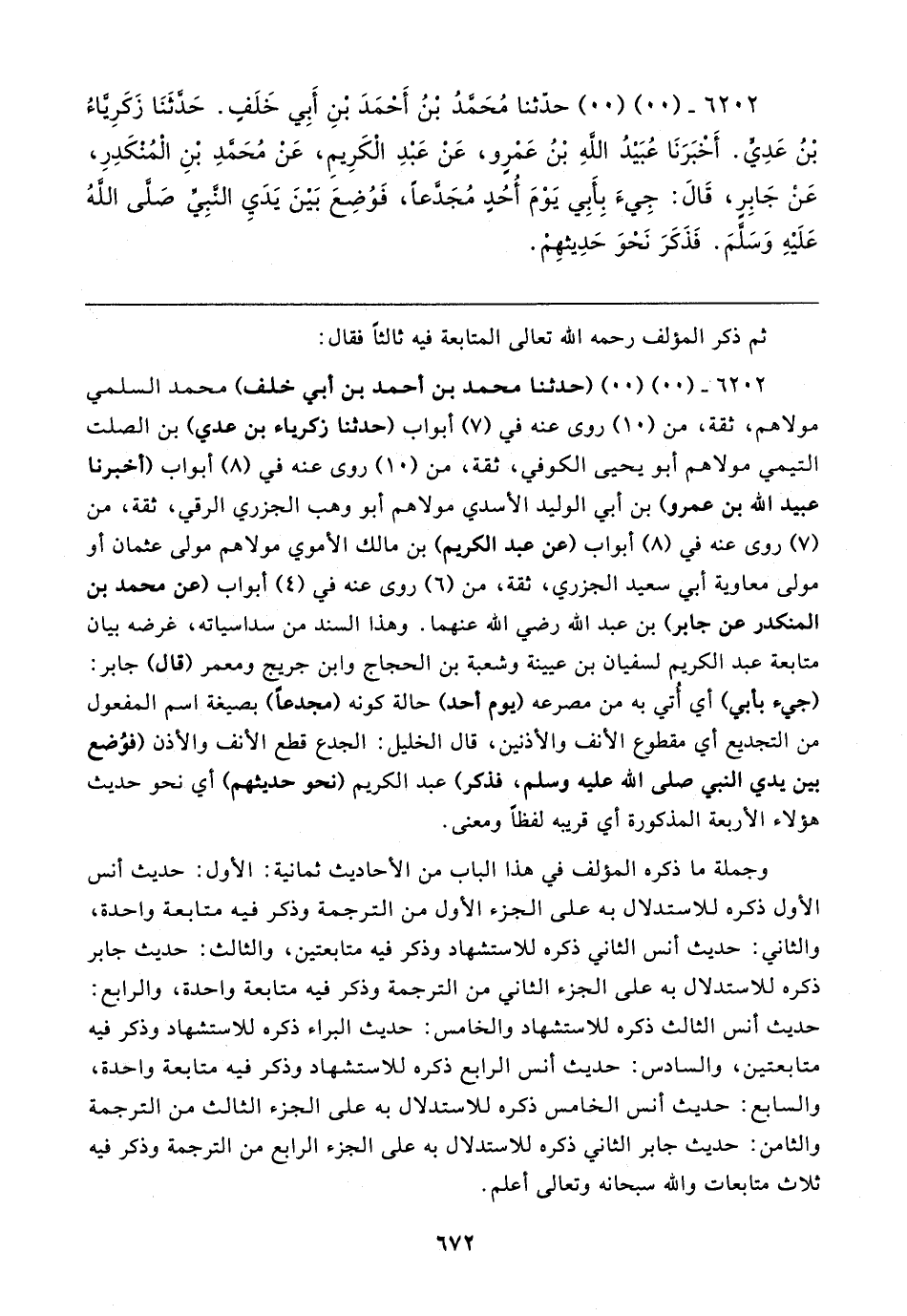 ٦٢٠٢ - (٠٠) (٠٠) (حدثنا محمد بن أحمد بن أبي خلف) محمد السلمي مولاهم، ثقة، من (١٠) روى عنه في (٧) أبواب (حدثنا زكرياء بن عدي) بن الصلت التيمي مولاهم أبو يحيى الكوفي، ثقة، من (١٠) روى عنه في (٨) أبواب (أخبرنا عبيد الله بن عمرو) بن أبي الوليد الأسدي مولاهم أبو وهب الجزري الرقي، ثقة، من (٧) روى عنه في (٨) أبواب (عن عبد الكريم) بن مالك الأموي مولاهم مولى عثمان أو مولى معاوية أبي سعيد الجزري، ثقة، من (٦) روى عنه في (٤) أبواب (عن محمد بن المنكدر عن جابر) بن عبد الله رضي الله عنهما. وهذا السند من سداسياته، غرضه بيان متابعة عبد الكريم لسفيان بن عيينة وشعبة بن الحجاج وابن جريج ومعمر (قال) جابر: (جيء بأبي) أي أُتي به من مصرعه (يوم أحد) حالة كونه (مجدعًا) بصيغة اسم المفعول من التجديع أي مقطوع الأنف والأذنين، قال الخليل: الجدع قطع الأنف والأذن (فوُضع بين يدي النبي صلى الله عليه وسلم، فذكر) عبد الكريم (نحو حديثهم) أي نحو حديث هؤلاء الأربعة المذكورة أي قريبه لفظًا ومعنى.