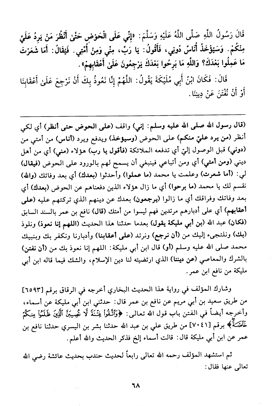 (قال رسول الله صلى الله عليه وسلم: إني) واقف (على الحوض حتَّى أنظر) أي لكي أنظر (من يرد عليّ منكم) على الحوض (وسيؤخذ) ويدفع ويرد (أناس) من أمتي من (دوني) قبل الوصول إليَّ أي تدفعه الملائكة (فأقول يا رب) هؤلاء (مني) أي من أهل ديني (ومن أمتي) أي ومن أتباعي فينبغي أن يسمح لهم بالورود على الحوض (فيقال) لي: (أما شعرت) وعلمت يا محمد (ما عملوا) وأحدثوا (بعدك) أي بعد وفاتك (والله) نقسم لك يا محمد (ما برحوا) أي ما زال هؤلاء الذين دفعناهم عن الحوض (بعدك) أي بعد وفاتك وفراقك أي ما زالوا (يرجعون) بعدك عن دينهم الَّذي تركتهم عليه (على أعقابهم) أي على أدبارهم مرتدين فهم ليسوا من أمتك (قال) نافع بن عمر بالسند السابق (فكان) عبد الله (بن أبي مليكة يقول) بعدما حَدَّثَنَا هذا الحديث (اللهم إنا نعوذ) ونلوذ (بك) ونلتجئ إليك من (أن نرجع) ونرتد (على أعقابنا) وأدبارنا ونكفر بك وبنبيك محمد صلى الله عليه وسلم (أو) قال ابن أبي مليكة: اللهم إنا نعوذ بك من (أن نفتن) بالشرك والمعاصي (عن ديننا) الَّذي ارتضيته لنا دين الإسلام، والشك فيما قاله ابن أبي مليكة من نافع ابن عمر.