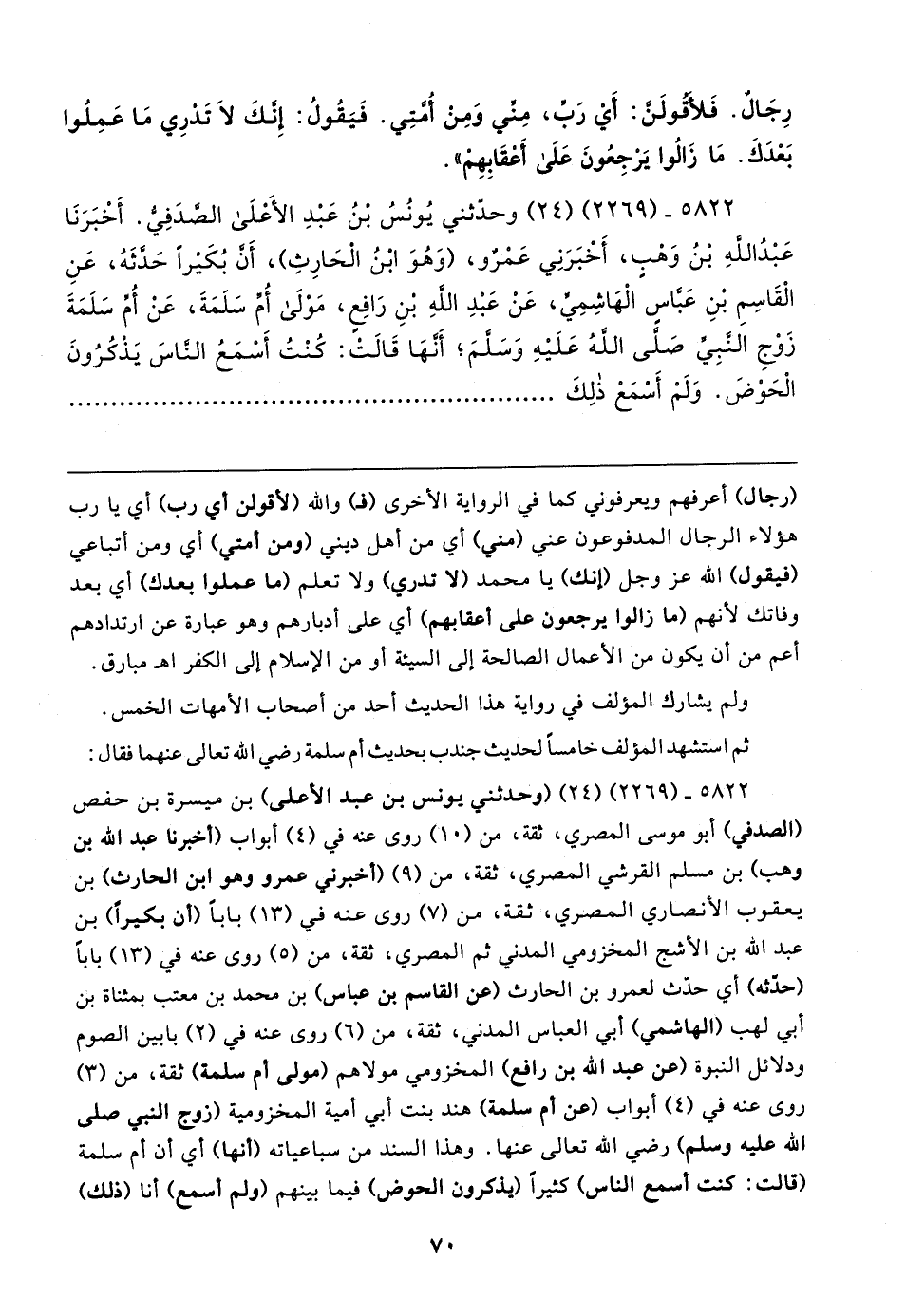 ٥٨٢٢ - (٢٢٦٩) (٢٤) (وحدثني يونس بن عبد الأعلى) بن ميسرة بن حفص (الصدفي) أبو موسى المصري، ثقة، من (١٥) روى عنه في (٤) أبواب (أخبرنا عبد الله بن وهب) بن مسلم القرشي المصري، ثقة، من (٩) (أخبرني عمرو وهو ابن الحارث) بن يعقوب الأنصاري المصري، ثقة، من (٧) روى عنه في (١٣) بابا (أن بكيرًا) بن عبد الله بن الأشج المخزومي المدني ثم المصري، ثقة، من (٥) روى عنه في (١٣) بابا (حدَّثه) أي حدَّث لعمرو بن الحارث (عن القاسم بن عباس) بن محمد بن معتب بمثناة بن أبي لهب (الهاشمي) أبي العباس المدني، ثقة، من (٦) روى عنه في (٢) بابين الصوم ودلائل النبوة (عن عبد الله بن رافع) المخزومي مولاهم (مولى أم سلمة) ثقة، من (٣) روى عنه في (٤) أبواب (عن أم سلمة) هند بنت أبي أمية المخزومية (زوج النبي صلى الله عليه وسلم) رضي الله تعالى عنها. وهذا السند من سباعياته (أنها) أي أن أم سلمة (قالت: كنت أسمع الناس) كثيرًا (يذكرون الحوض) فيما بينهم (ولم أسمع) أنا (ذلك)