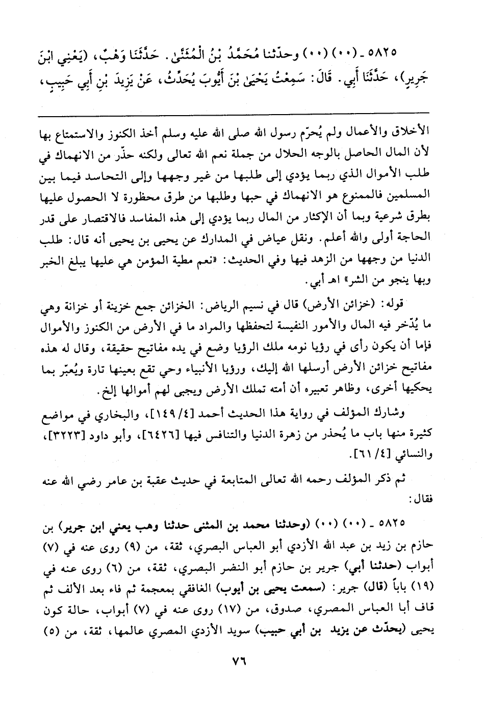 ٥٨٢٥ - (٠٠) (٠٠) (وحدثنا محمد بن المثنى حَدَّثَنَا وهب يعني ابن جرير) بن حازم بن زيد بن عبد الله الأزدي أبو العباس البصري، ثقة، من (٩) روى عنه في (٧) أبواب (حَدَّثَنَا أبي) جرير بن حازم أبو النضر البصري، ثقة، من (٦) روى عنه في (١٩) بابا (قال) جرير: (سمعت يحيى بن أيوب) الغافقي بمعجمة ثم فاء بعد الألف ثم قاف أبا العباس المصري، صدوق، من (١٧) روى عنه في (٧) أبواب، حالة كون يحيى (يحدّث عن بزبد بن أبي حببب) سويد الأزدي المصري عالمها، ثقة، من (٥)