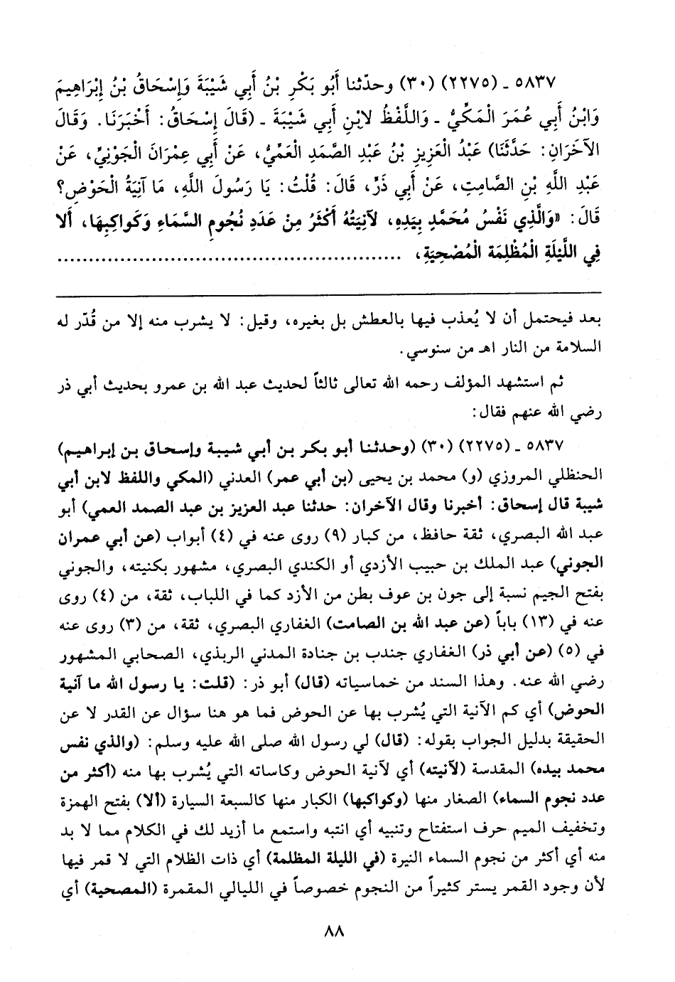 ٥٨٣٧ - (٢٢٧٥) (٣٠) وحدَّثنا أَبُو بَكْرٍ بْنُ أَبِي شَيبَةَ وإِسْحَاقُ بن إِبْرَاهِيمَ وَابْنُ أَبِي عُمَرَ الْمَكِّيُّ -وَاللَّفظُ لابْنِ أَبِي شَيبَةَ- (قَال إِسحَاقُ: أَخبَرَنَا. وَقَال الآخَرَانِ: حَدَّثَنَا) عَبْدُ الْعَزِيزِ بْنُ عَبْدِ الصَّمَدِ العَمِّيُّ، عَن أَبِي عِفرَانَ الجَوْنِيِّ، عَنْ عَبْدِ اللهِ بْنِ الصَّامِتِ، عَن أَبِي ذَرٍّ، قَال: قُلْتُ: يَا رَسُولَ اللهِ، مَا آنِيَةُ الْحَوْضِ؟ قَال: "وَالَّذِي نَفْسُ مُحَمَّدٍ بِيَدِهِ، لآنِيَتُهُ أَكْثَرُ مِنْ عَدَدِ نُجُومِ السَّمَاءِ وَكَواكِبِهَا، أَلا فِي اللَّيلَةِ الْمُظلِمَة الْمُصْحِيَةِ،