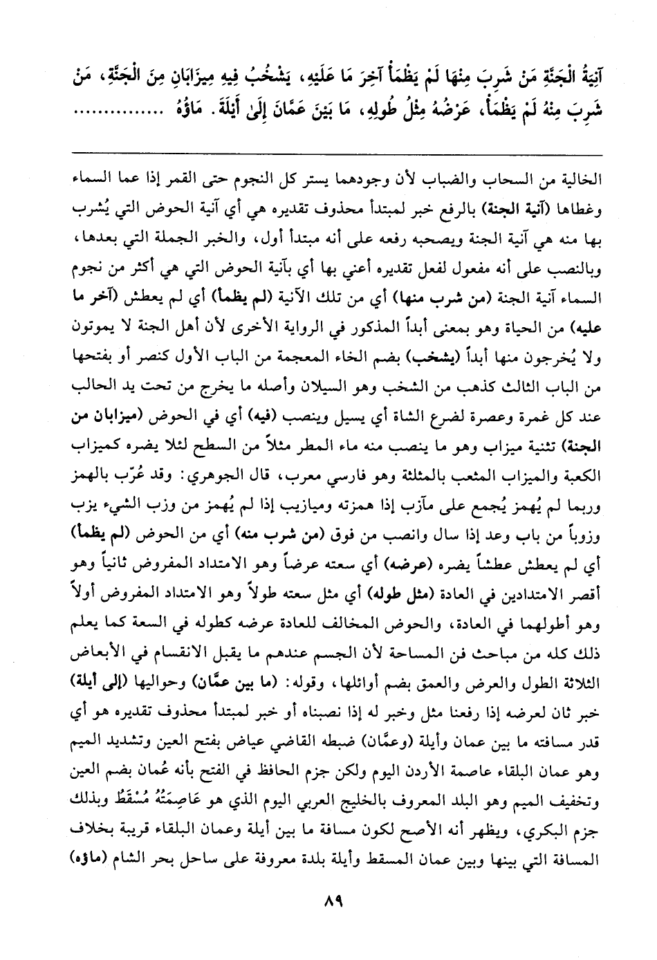 الخالية من السحاب والضباب لأن وجودهما يستر كل النجوم حتَّى القمر إذا عما السماء وغطاها (آنية الجنّة) بالرفع خبر لمبتدأ محذوف تقديره هي أي آنية الحوض التي يُشرب بها منه هي آنية الجنّة ويصحبه رفعه على أنَّه مبتدأ أول، والخبر الجملة التي بعدها، وبالنصب على أنَّه مفعول لفعل تقديره أعني بها أي بآنية الحوض التي هي أكثر من نجوم السماء آنية الجنّة (من شرب منها) أي من تلك الآنية (لم يظمأ) أي لم يعطش (آخر ما عليه) من الحياة وهو بمعنى أبدًا المذكور في الرواية الأخرى لأن أهل الجنّة لا يموتون ولا يُخرجون منها أبدًا (يشخب) بضم الخاء المعجمة من الباب الأول كنصر أو بفتحها من الباب الثالث كذهب من الشخب وهو السيلان وأصله ما يخرج من تحت يد الحالب عند كل غمرة وعصرة لضرع الثاة أي يسيل وينصب (فيه) أي في الحوض (ميزابان من الجنّة) تثنية ميزاب وهو ما ينصب منه ماء المطر مثلًا من السطح لئلا يضره كميزاب الكعبة والميزاب المثعب بالمثلثة وهو فارسي معرب، قال الجوهري: وقد عُرِّب بالهمز وربما لم يُهمز يُجمع على مآزب إذا همزته وميازيب إذا لم يُهمز من وزب الشيء يزب وزوبًا من باب وعد إذا سال وانصب من فوق (من شرب منه) أي من الحوض (لم يظمأ) أي لم يعطش عطشًا يضره (عرضه) أي سعته عرضًا وهو الامتداد المفروض ثانيًا وهو أقصر الامتدادين في العادة (مثل طوله) أي مثل سعته طولًا وهو الامتداد المفروض أولًا وهو أطولهما في العادة، والحوض المخالف للعادة عرضه كطوله في السعة كما يعلم ذلك كله من مباحث فن المساحة لأن الجسم عندهم ما يقبل الانقسام في الأبعاض الثلاثة الطول والعرض والعمق بضم أوائلها، وقوله: (ما بين عمَّان) وحواليها (إلى أيلة) خبر ثان لعرضه إذا رفعنا مثل وخبر له إذا نصبناه أو خبر لمبتدأ محذوف تقديره هو أي قدر مسافته ما بين عثمان وأيلة (وعمَّان) ضبطه القاضي عياض بفتح العين وتشديد الميم وهو عثمان البلقاء عاصمة الأردن اليوم ولكن جزم الحافظ في الفتح بأنه عُمان بضم العين وتخفيف الميم وهو البلد المعروف بالخليج العربي اليوم الَّذي هو عَاصِمَتُهُ مُسْقَطُ وبذلك جزم البكري، ويظهر أنَّه الأصح لكون مسافة ما بين أيلة وعمان البلقاء قريبة بخلاف المسافة التي بينها وبين عثمان المسقط وأيلة بلدة معروفة على ساحل بحر الشام (ماؤه)