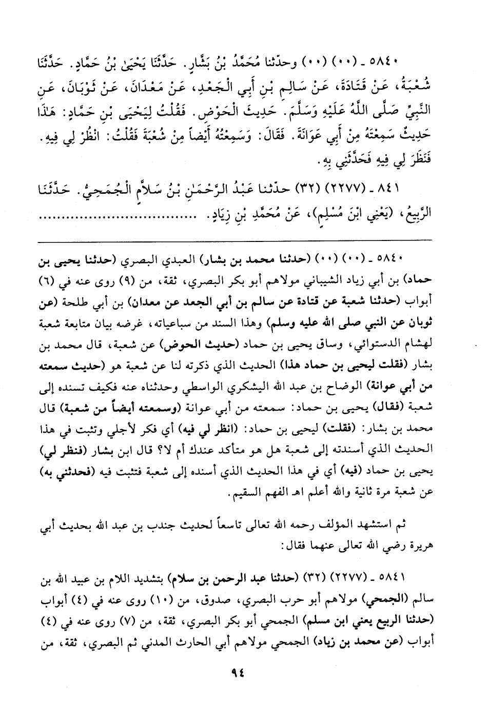٥٨٤٠ - (٠٠) (٠٠) (حدثنا محمَّد بن بشار) العبدي البصري (حدثنا يحيى بن حماد) بن أبي زياد الشيباني مولاهم أبو بكر البصري، ثقة، من (٩) روى عنه في (٦) أبواب (حدثنا شعبة عن قتادة عن سالم بن أبي الجعد عن معدان) بن أبي طلحة (عن ثوبان عن النبي - صلى الله عليه وسلم -) وهذا السند من سباعياته، غرضه بيان متابعة شعبة لهشام الدستوائي، وساق يحيى بن حماد (حديث الحوض) عن شعبة، قال محمَّد بن بشار (فقلت ليحيى بن حماد هذا) الحديث الذي ذكرته لنا عن شعبة هو (حديث سمعته من أبي عوانة) الوضاح بن عبد الله اليشكري الواسطي وحدثناه عنه فكيف تسنده إلى شعبة (فقال) يحيى بن حماد: سمعته من أبي عوانة (وسمعته أيضًا من شعبة) قال محمَّد بن بشار: (فقلت) ليحيى بن حماد: (انظر لي فيه) أي فكر لأجلي وتثبت في هذا الحديث الذي أسندته إلى شعبة هل هو متأكد عندك أم لا؟ قال ابن بشار (فنظر لي) يحيى بن حماد (فيه) أي في هذا الحديث الذي أسنده إلى شعبة فتثبت فيه (فحدثني به) عن شعبة مرة ثانية والله أعلم اهـ الفهم السقيم.