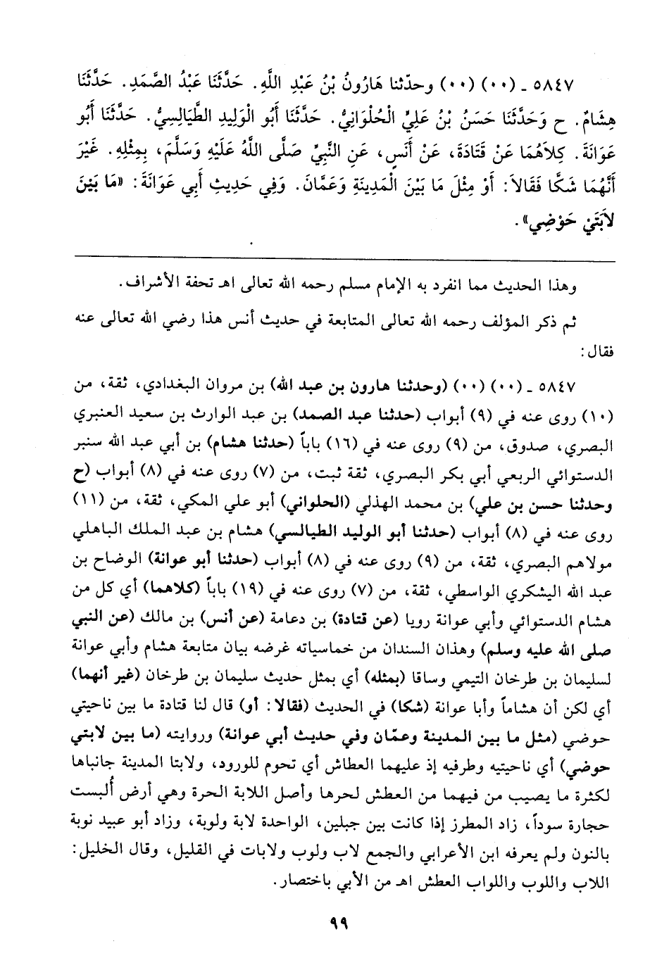 ٥٨٤٧ - (٠٠) (٠٠) (وحدثنا هارون بن عبد الله) بن مروان البغدادي، ثقة، من (١٠) روى عنه في (٩) أبواب (حدثنا عبد الصمد) بن عبد الوارث بن سعيد العنبري البصري، صدوق، من (٩) روى عنه في (١٦) بابا (حدثنا هشام) بن أبي عبد الله سنبر الدستوائي الربعي أبي بكر البصري، ثقة ثبت، من (٧) روى عنه في (٨) أبواب (ح وحدثنا حسن بن علي) بن محمَّد الهذلي (الحلواني) أبو علي المكي، ثقة، من (١١) روى عنه في (٨) أبواب (حدثنا أبو الوليد الطيالسي) هشام بن عبد الملك الباهلي مولاهم البصري، ثقة، من (٩) روى عنه في (٨) أبواب (حدثنا أبو عوانة) الوضاح بن عبد الله اليشكري الواسطي، ثقة، من (٧) روى عنه في (١٩) بابا (كلاهما) أي كل من هشام الدستوائي وأبي عوانة رويا (عن قتادة) بن دعامة (عن أنس) بن مالك (عن النبي صلى الله عليه وسلم) وهذان السندان من خماسياته غرضه بيان متابعة هشام وأبي عوانة لسليمان بن طرخان التيمي وساقا (بمثله) أي بمثل حديث سليمان بن طرخان (غير أنهما) أي لكن أن هشامًا وأبا عوانة (شكا) في الحديث (فقالا: أو) قال لنا قتادة ما بين ناحيتي حوضي (مثل ما بين المدينة وعمّان وفي حديث أبي عوانة) وروايته (ما بين لابتي حوضي) أي ناحيتيه وطرفيه إذ عليهما العطاش أي تحوم للورود، ولابتا المدينة جانباها لكثرة ما يصيب من فيهما من العطش لحرها وأصل اللابة الحرة وهي أرض أُلبست حجارة سودًا، زاد المطرز إذا كانت بين جبلين، الواحدة لابة ولوبة، وزاد أبو عبيد نوبة بالنون ولم يعرفه ابن الأعرابي والجمع باب ولوب ولابات في القليل، وقال الخليل: اللاب واللوب واللواب العطش اهـ من الأبي باختصار.